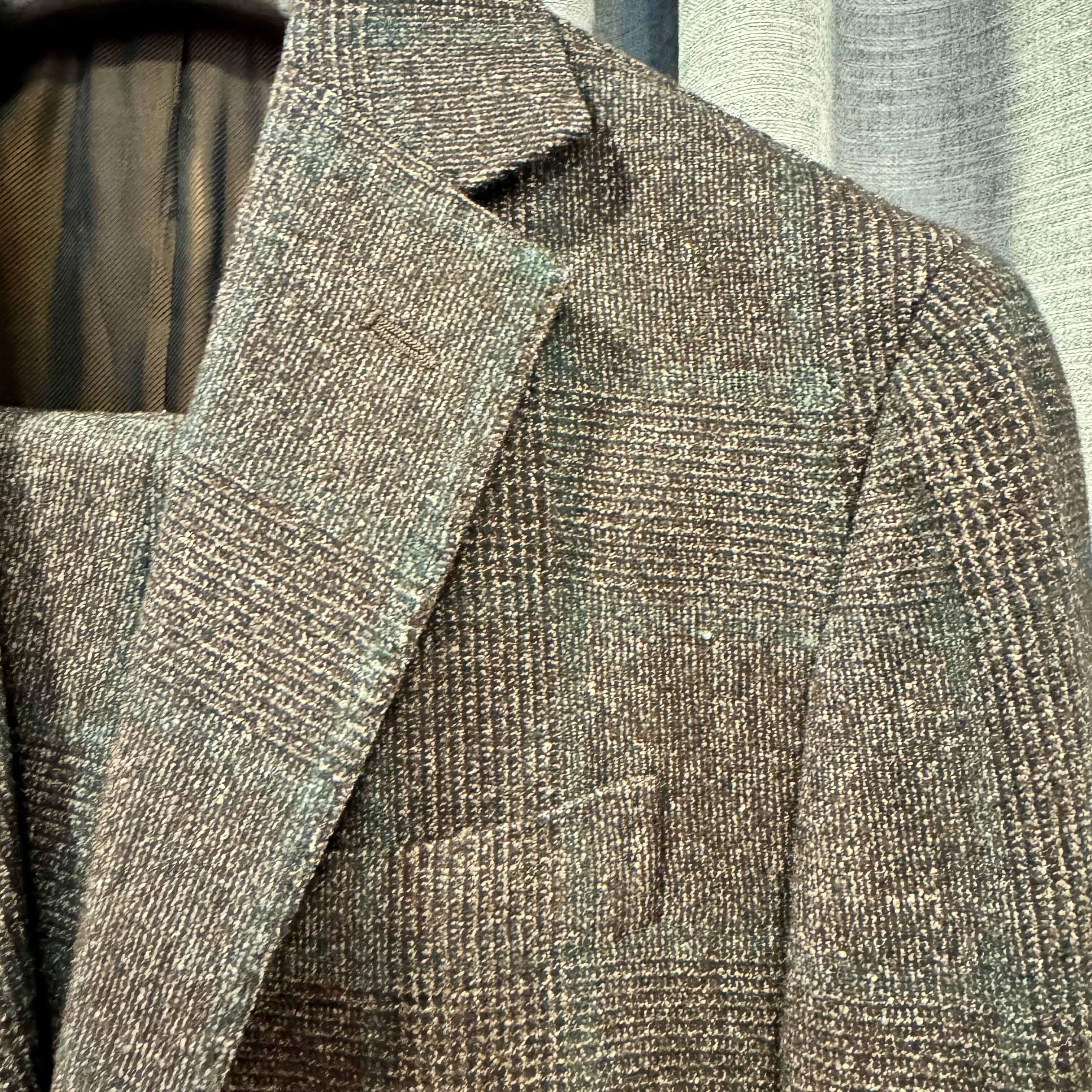 color : チャコールとダークブラウン系のミックスのグレンチェック地にグリーンのペーン