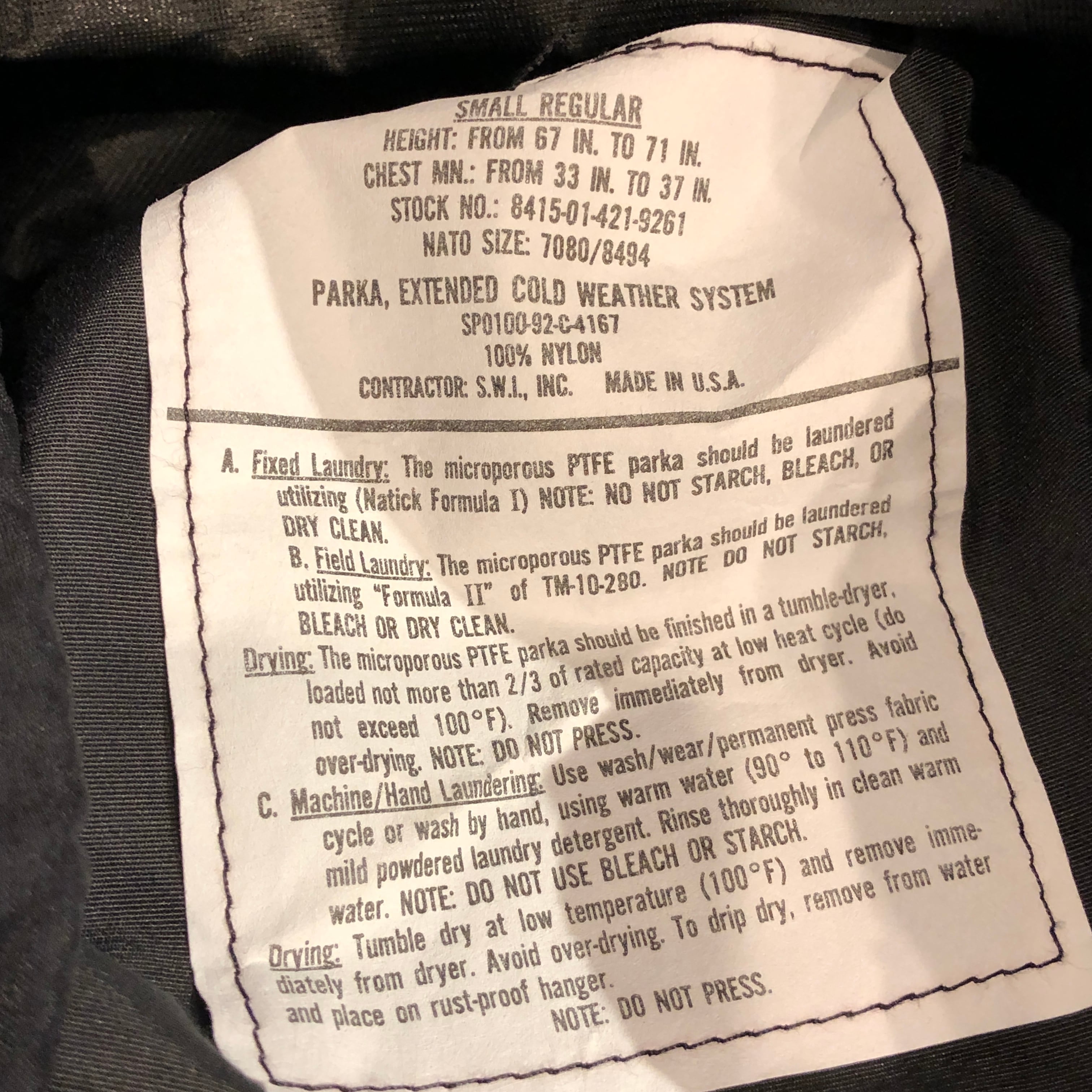 ⊕1990'S S.W.I INC ECWCS BLACK JACKET