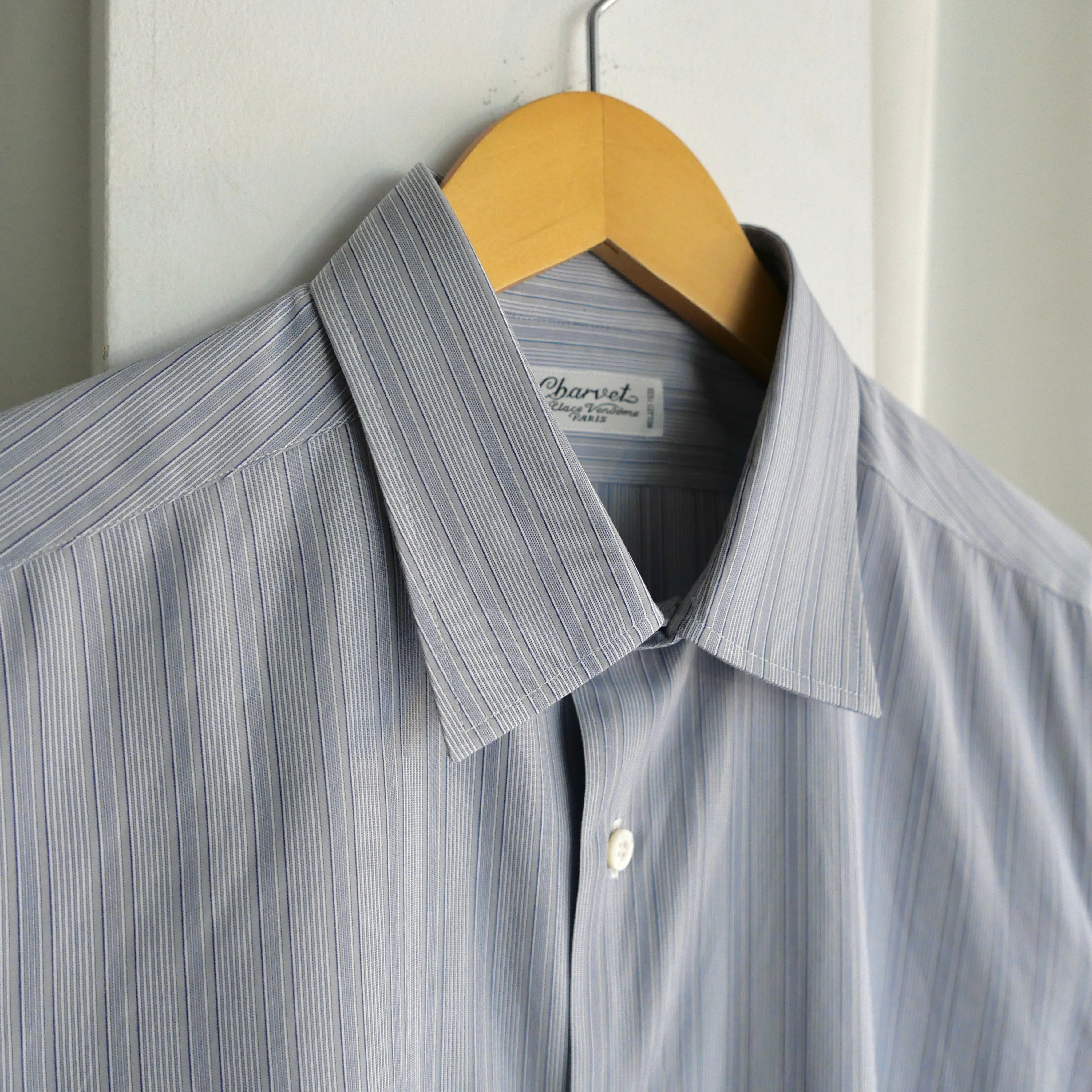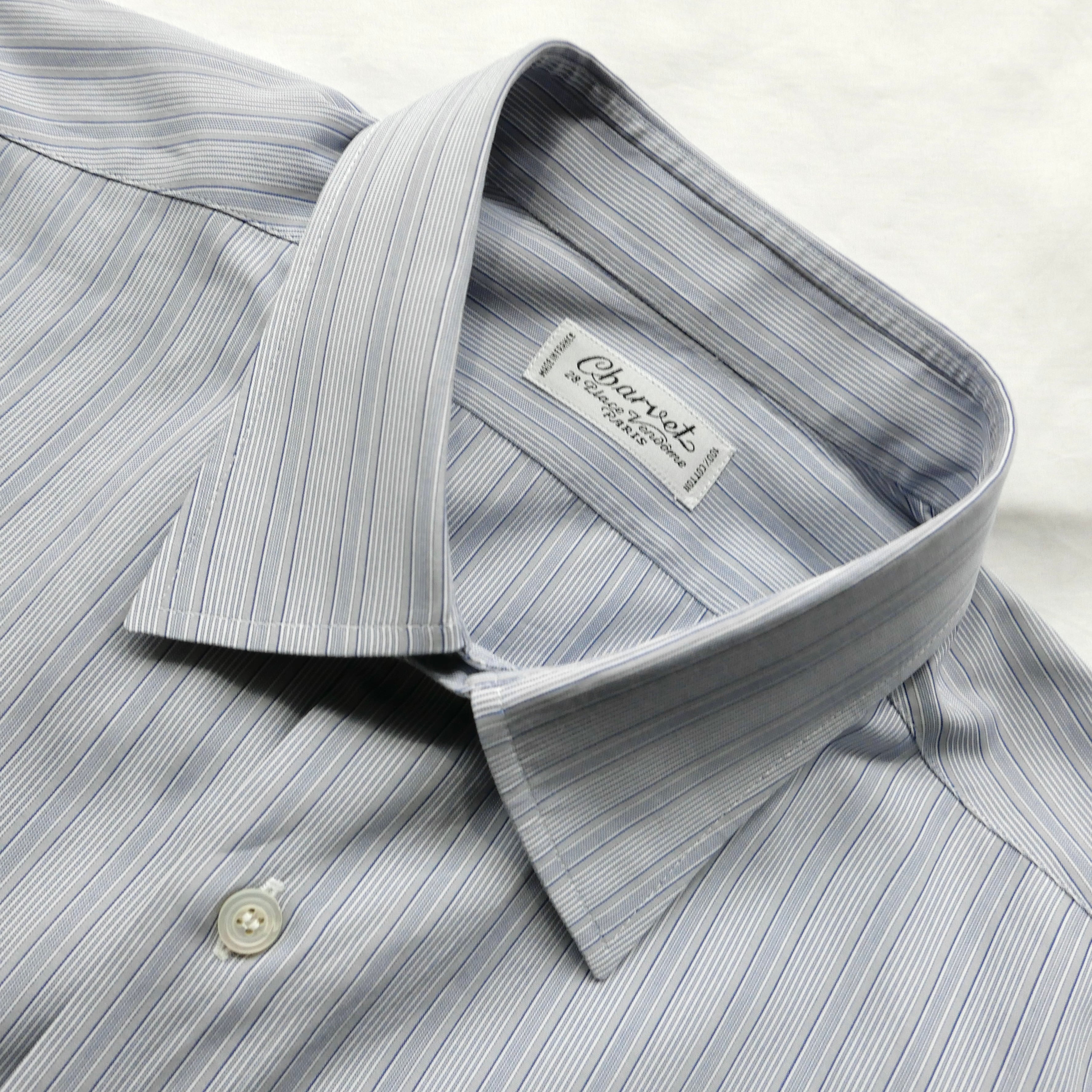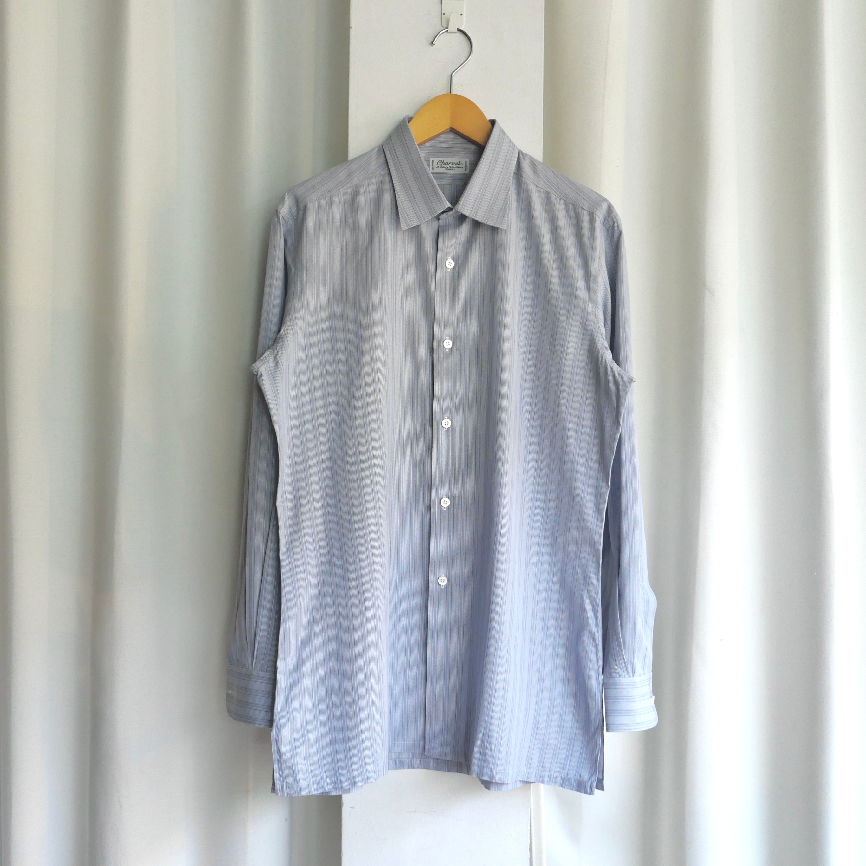 グレーをベースとしたブルーストライプの好配色、シャルベを象徴するディテールのスクエアカット、袖はカフスではなく通常のボタンで留めるタイプ、実寸サイズはM.L位の非常に良い条件の一着。
