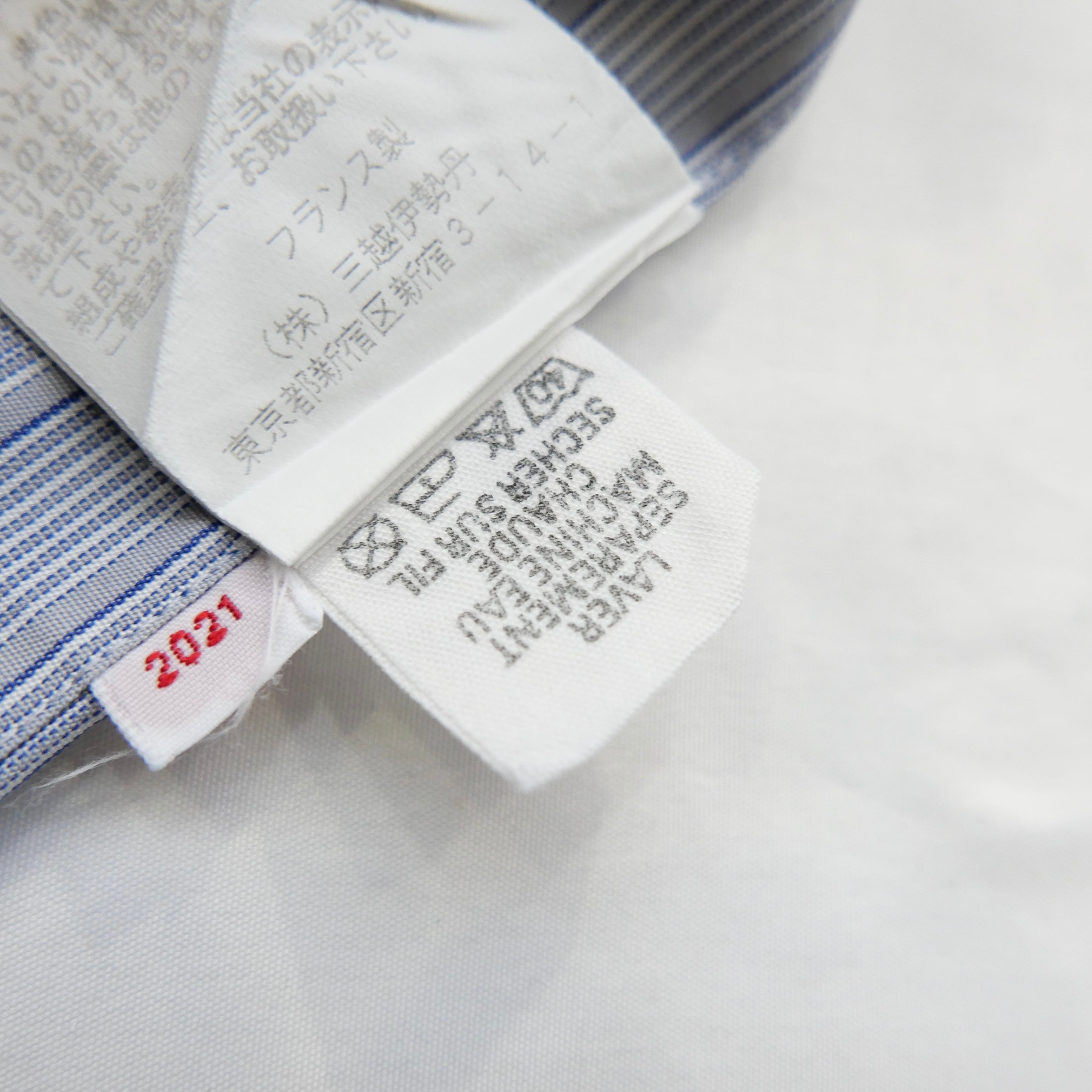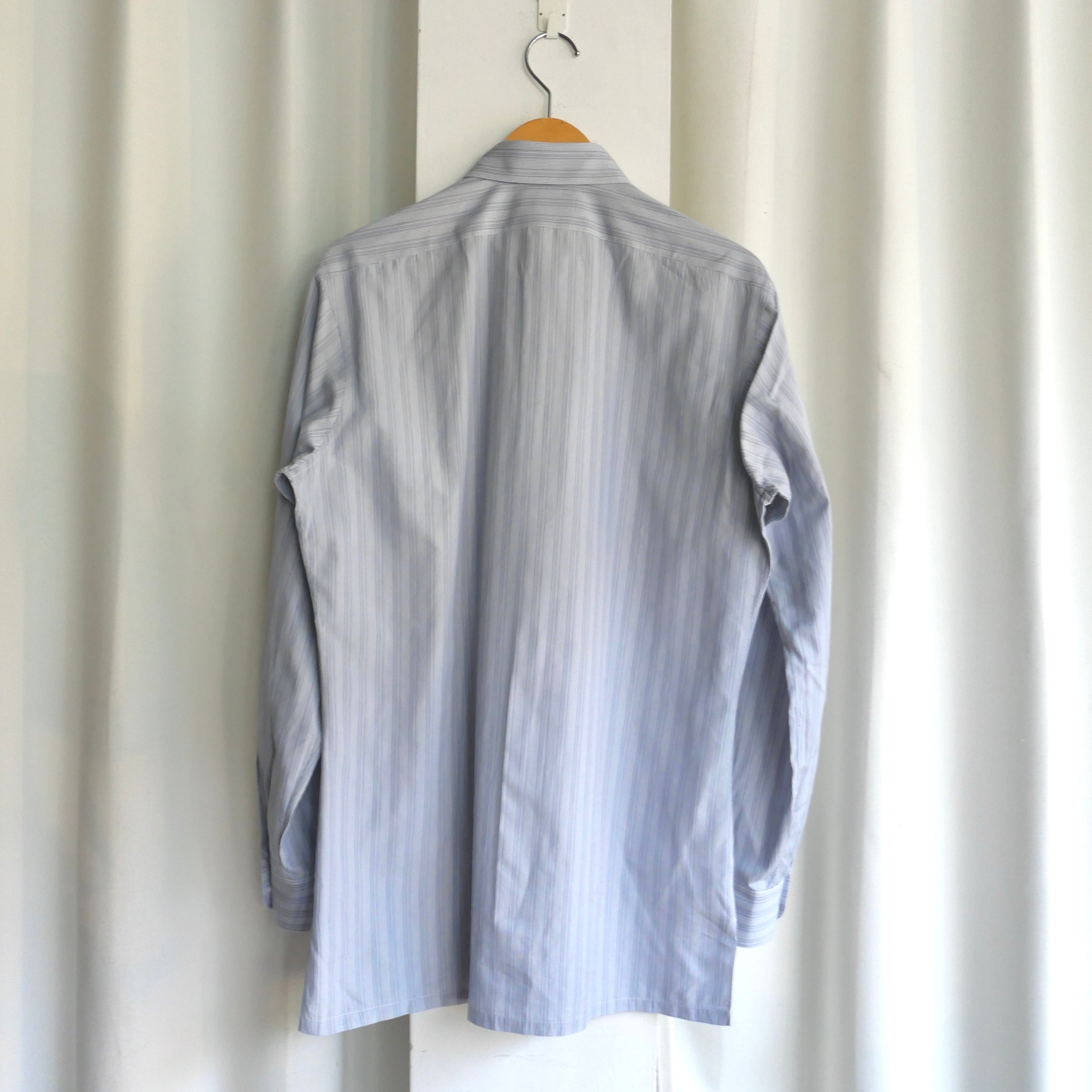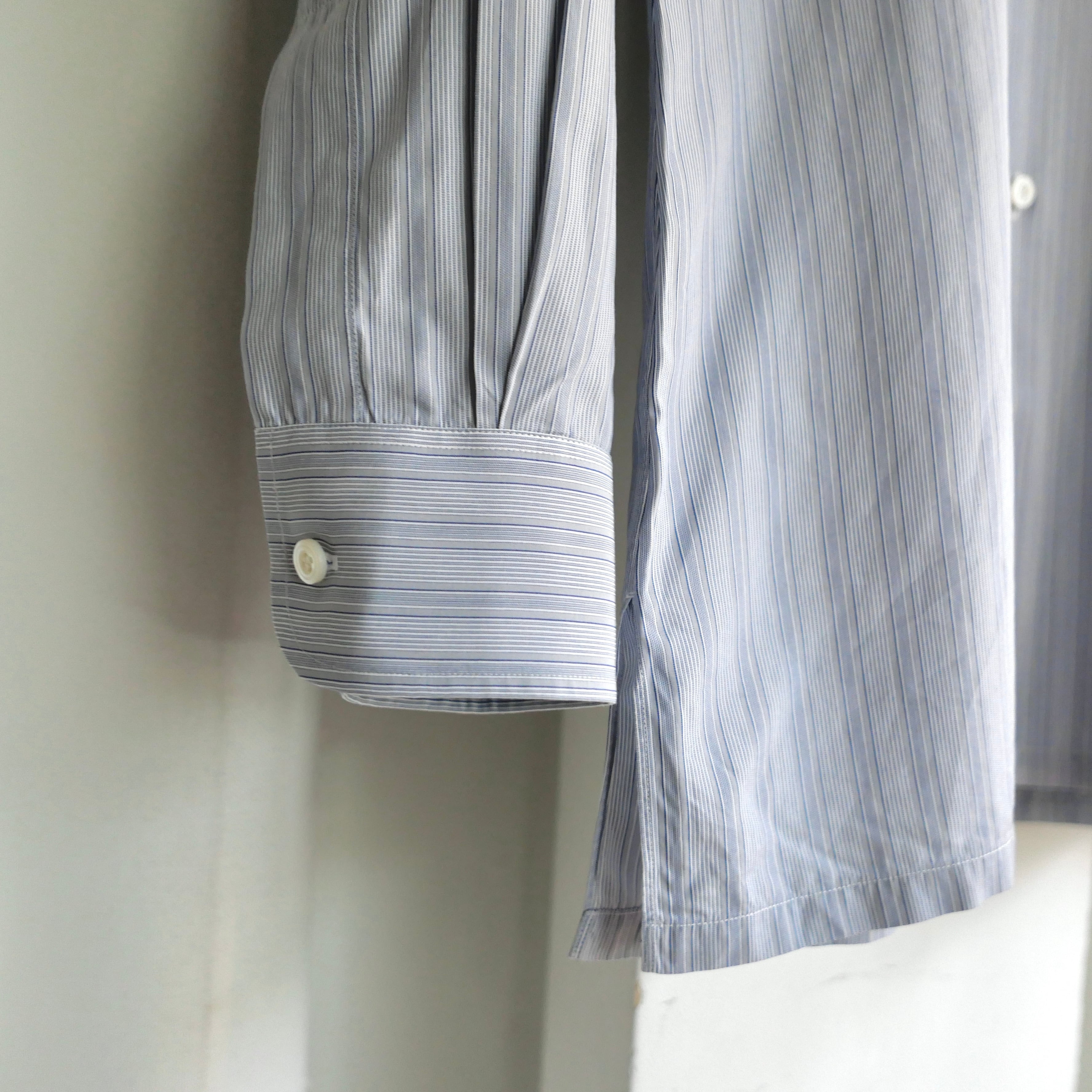グレーをベースとしたブルーストライプの好配色、シャルベを象徴するディテールのスクエアカット、袖はカフスではなく通常のボタンで留めるタイプ、実寸サイズはM.L位の非常に良い条件の一着。