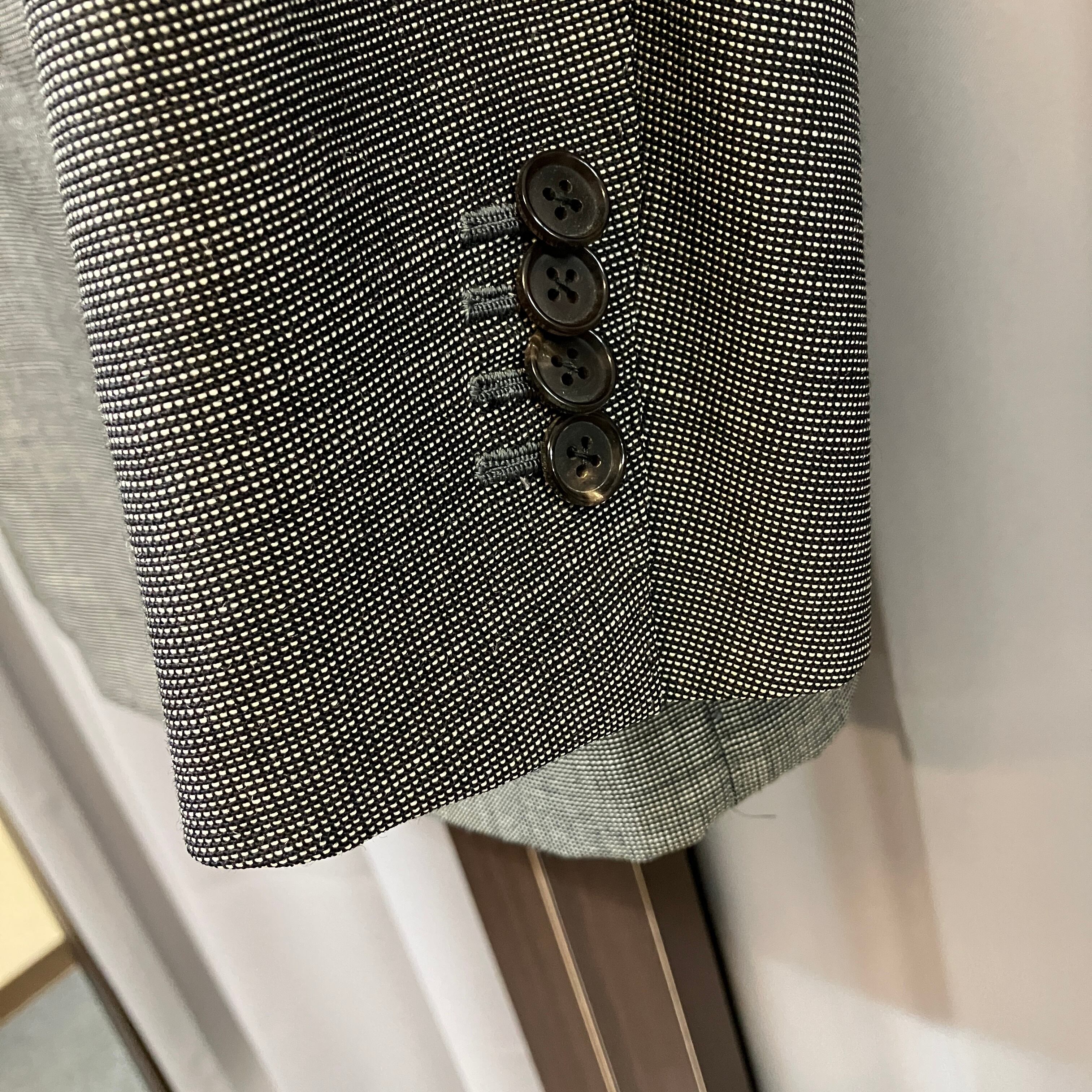 画像のようにジャケットのほつれ、スラックスにシミ汚れ等が見られます。