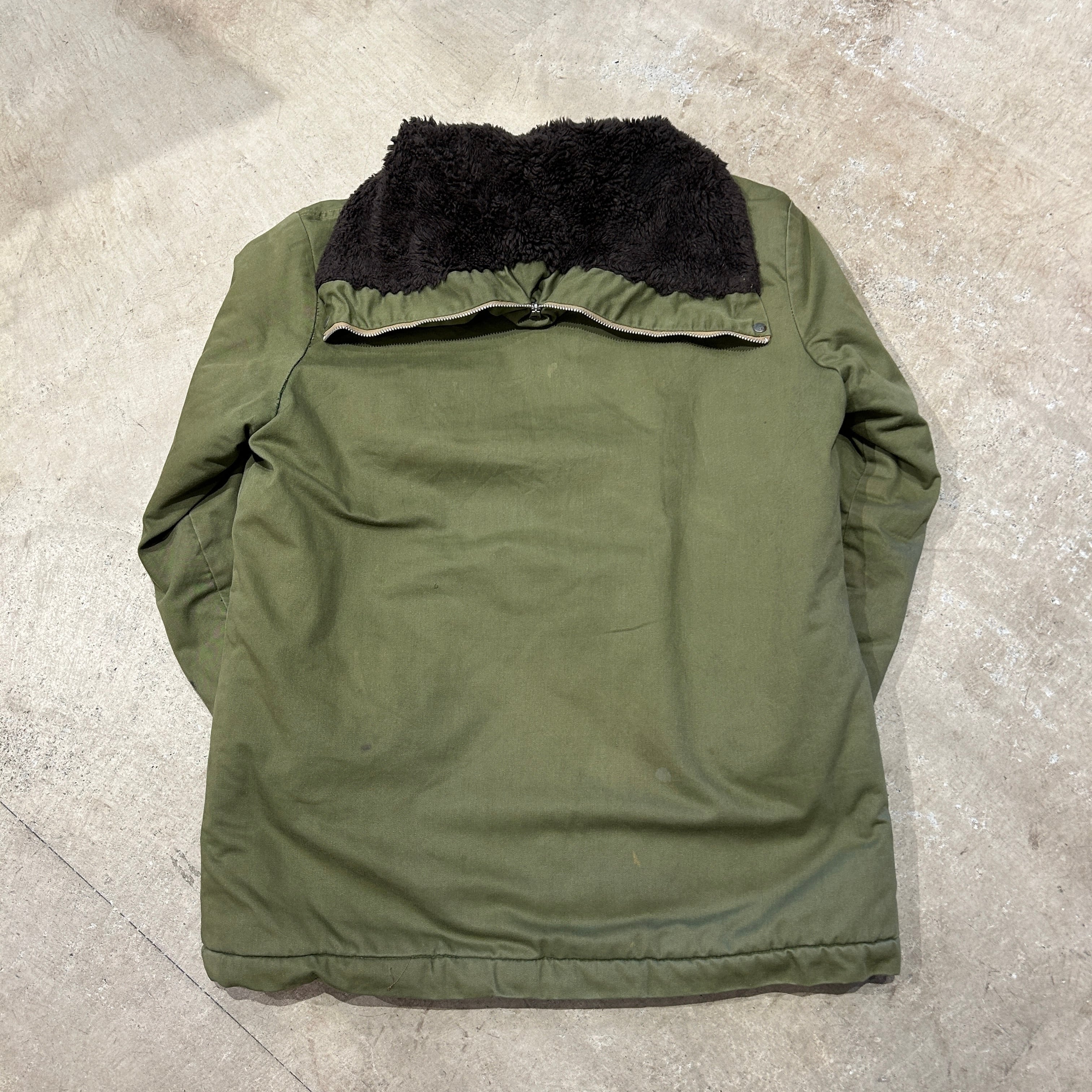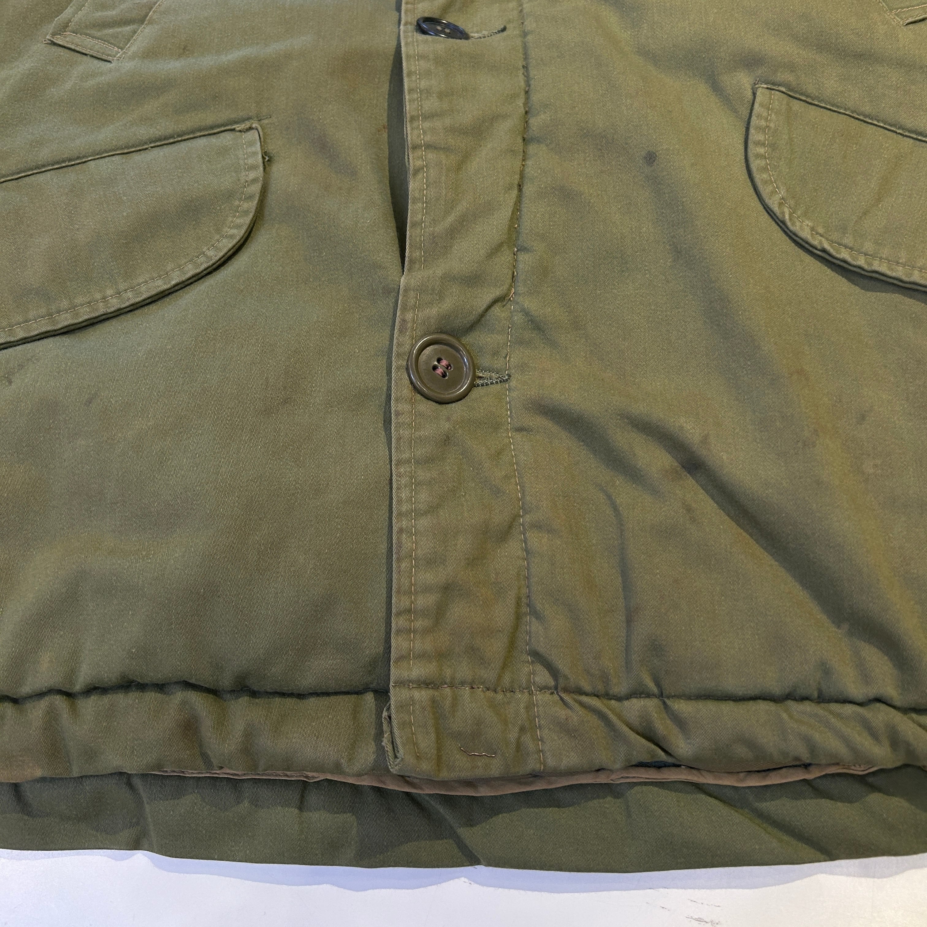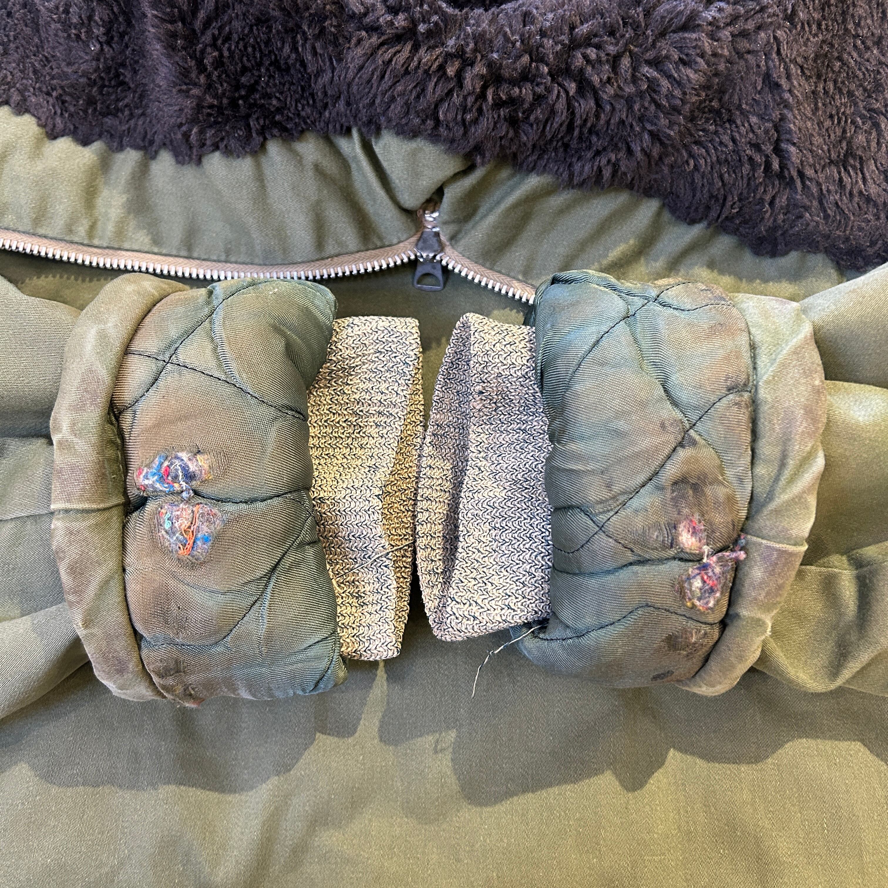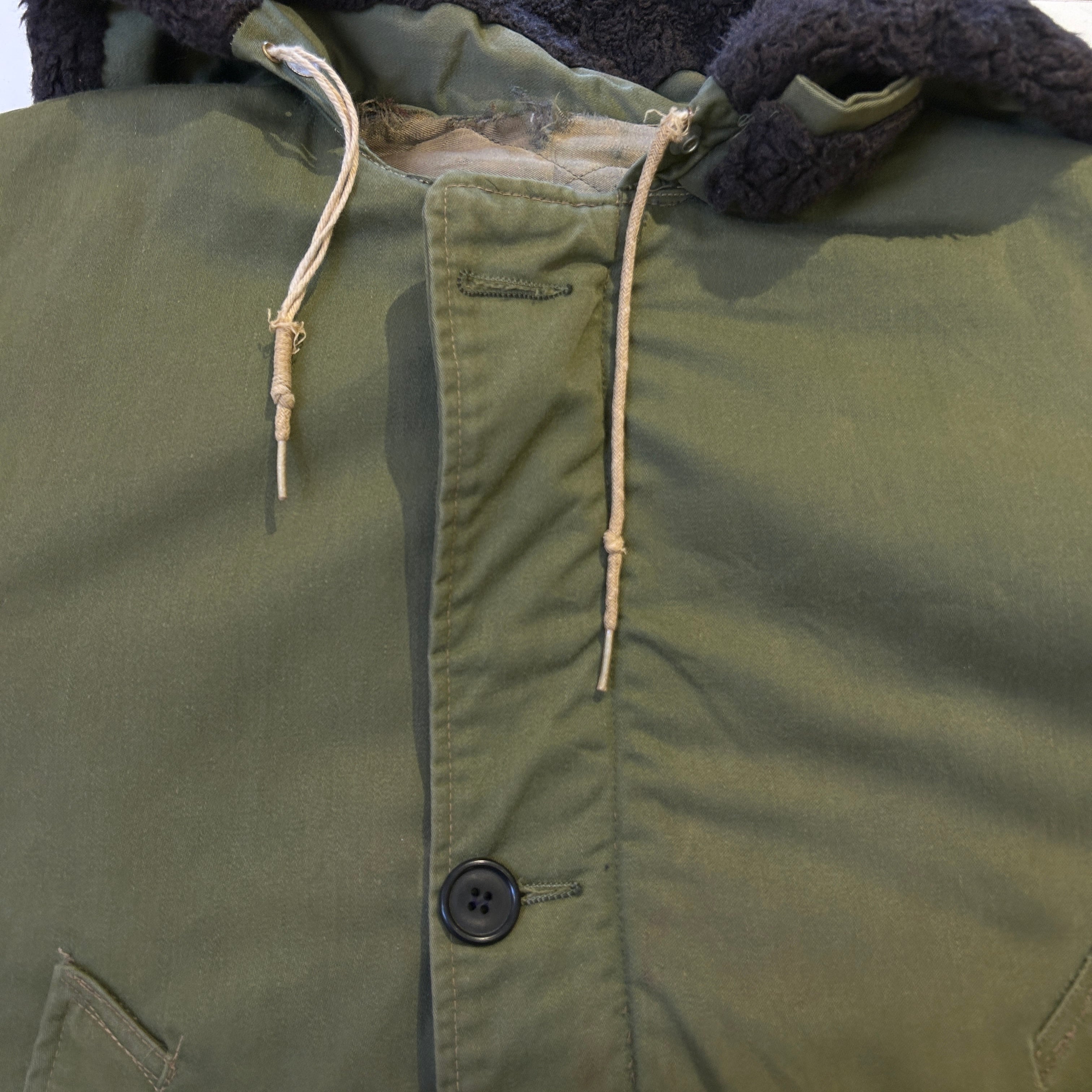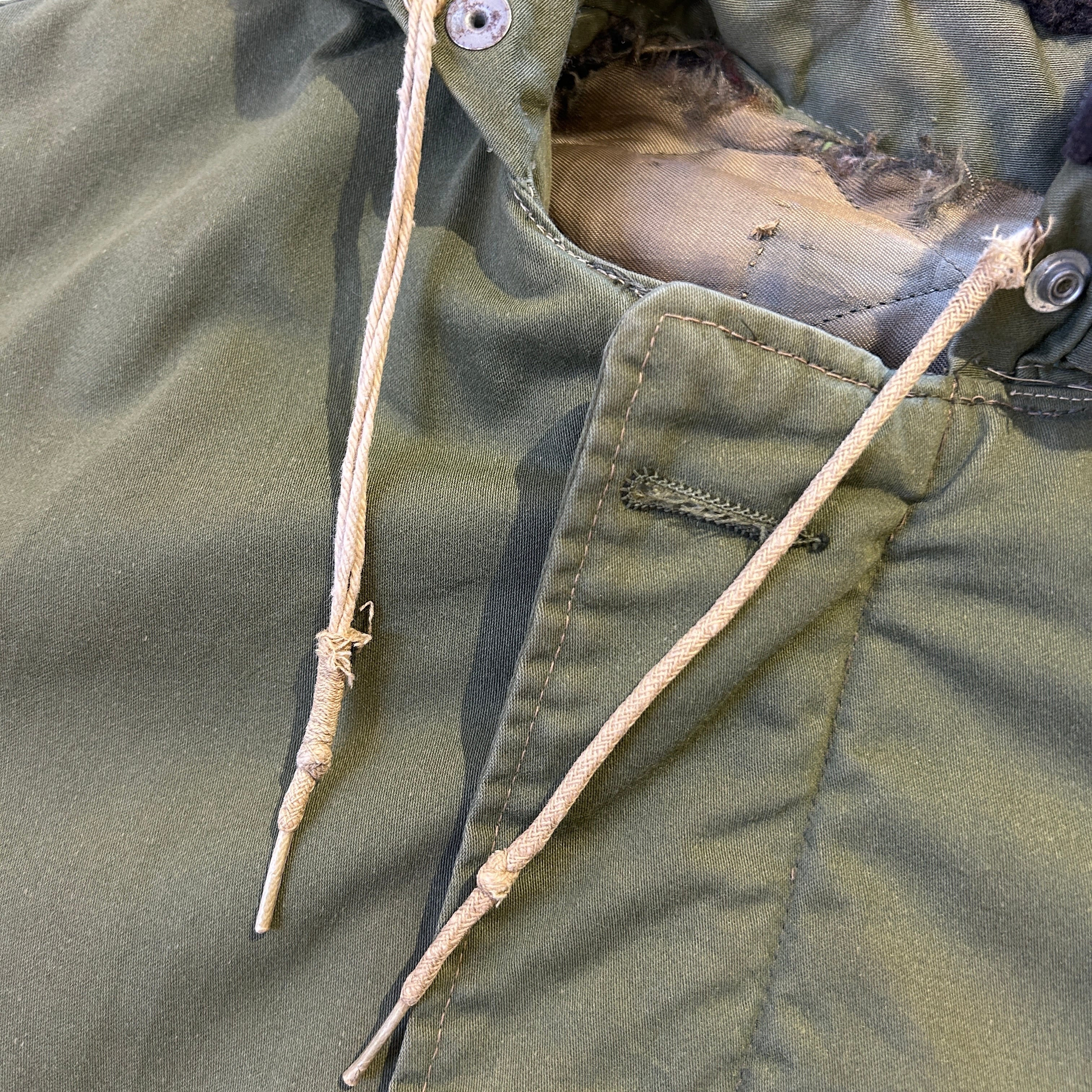 画像の様にドローコードにダメージ、ライナーにダメージ、全体的に汚れやスレ等の使用感ございます。所々にリステッチがございます。ヴィンテージ慣れされた方にオススメの商品です。