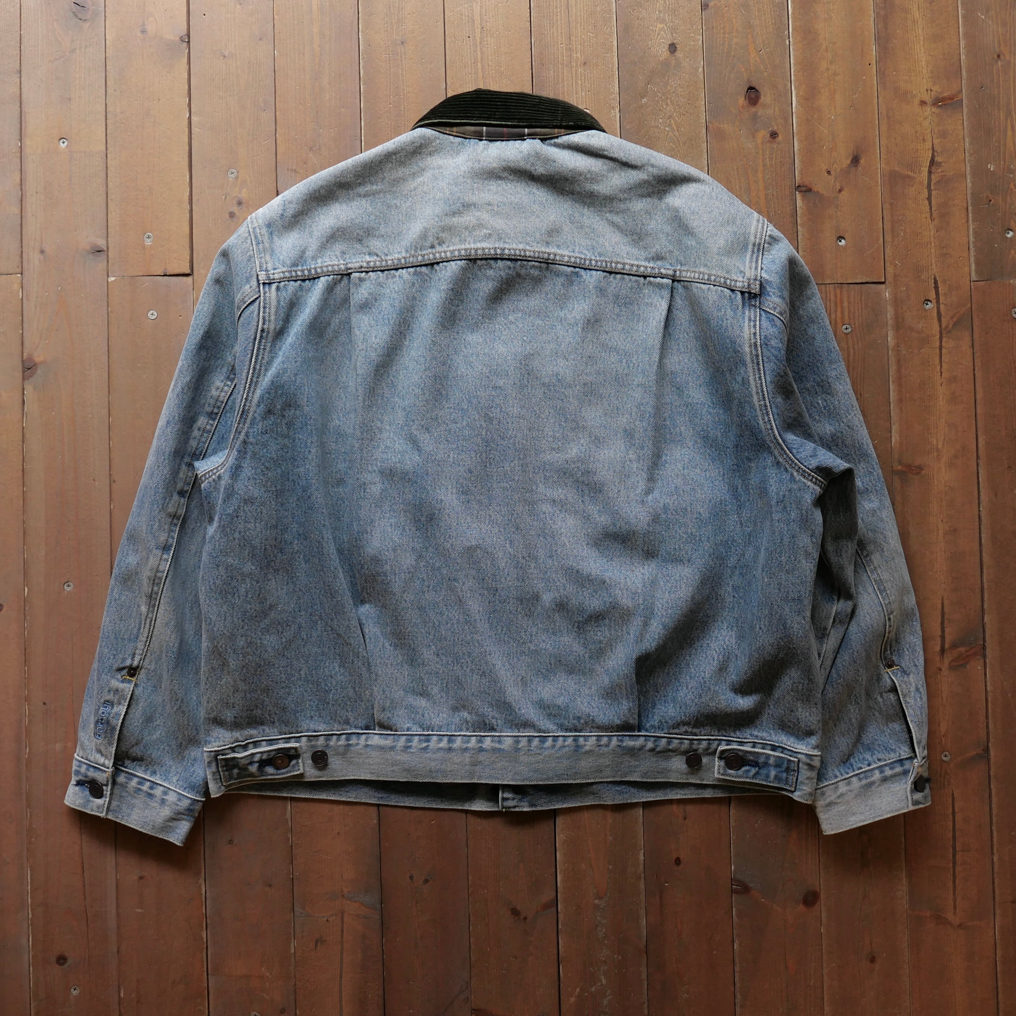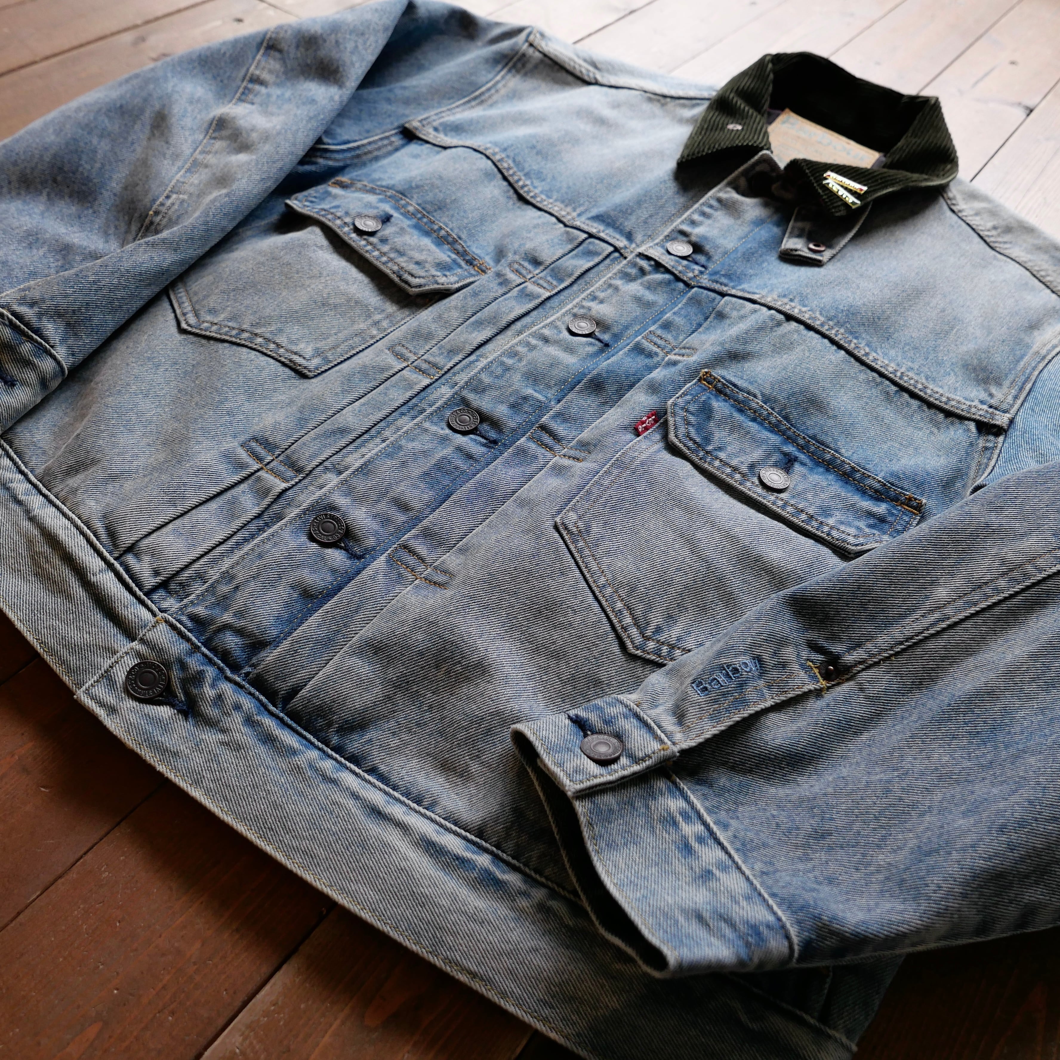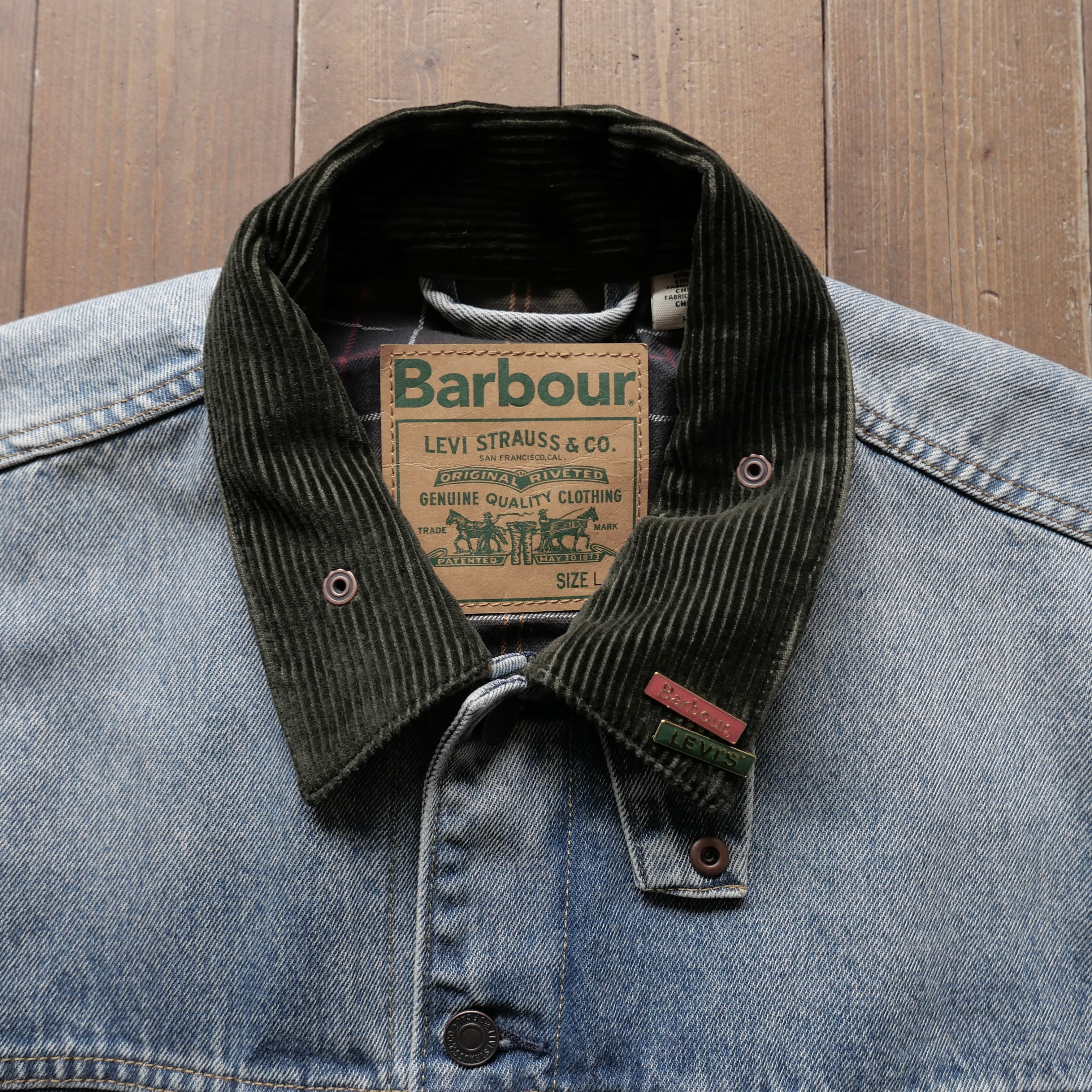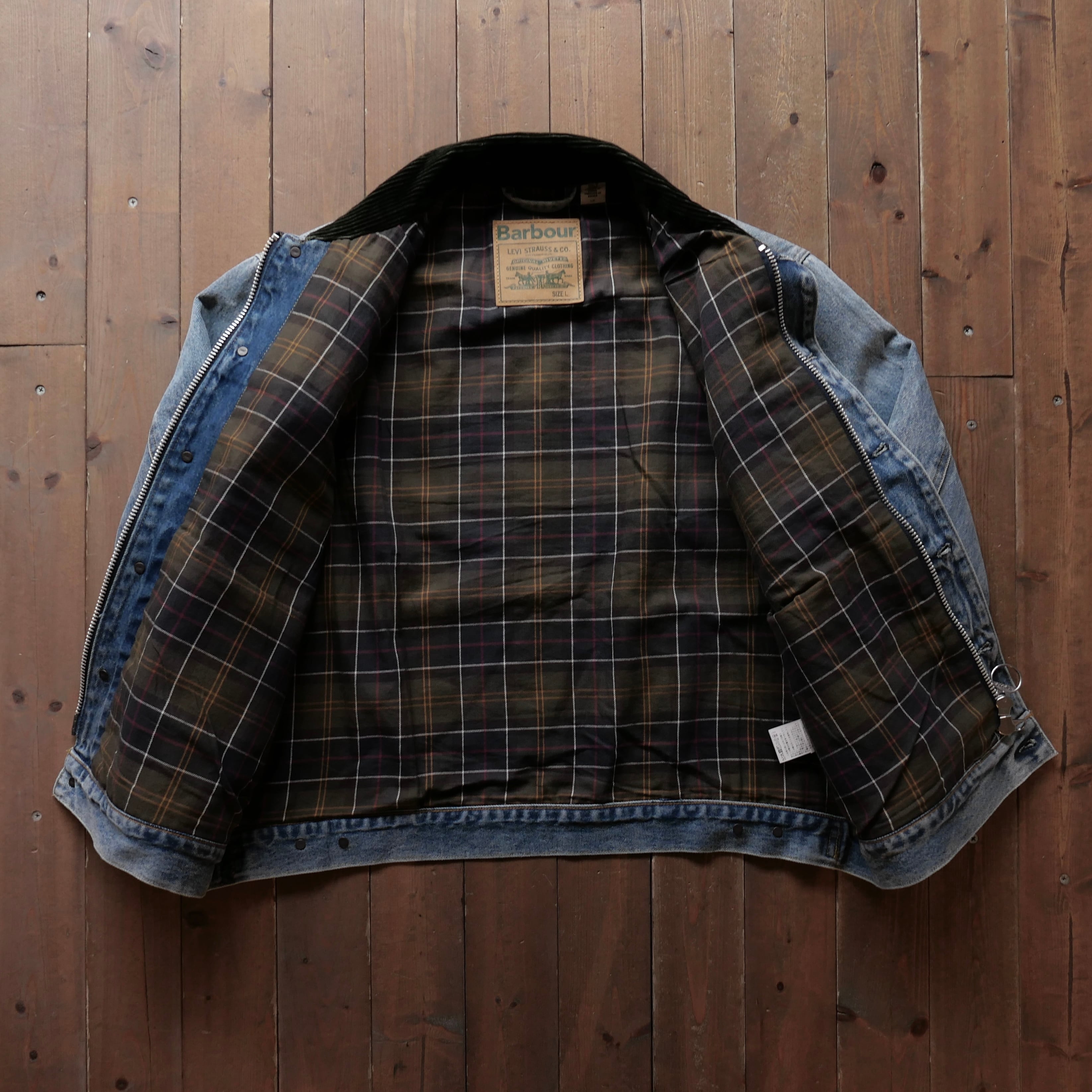 リーバイスのセカンドモデルを基にしたデニムジャケットにバブアーのコーデュロイ衿、シグネチャーカラーのチェック柄をライニングに採用した両ブランドの特徴を見事に生かしたデザインのアイテムです。