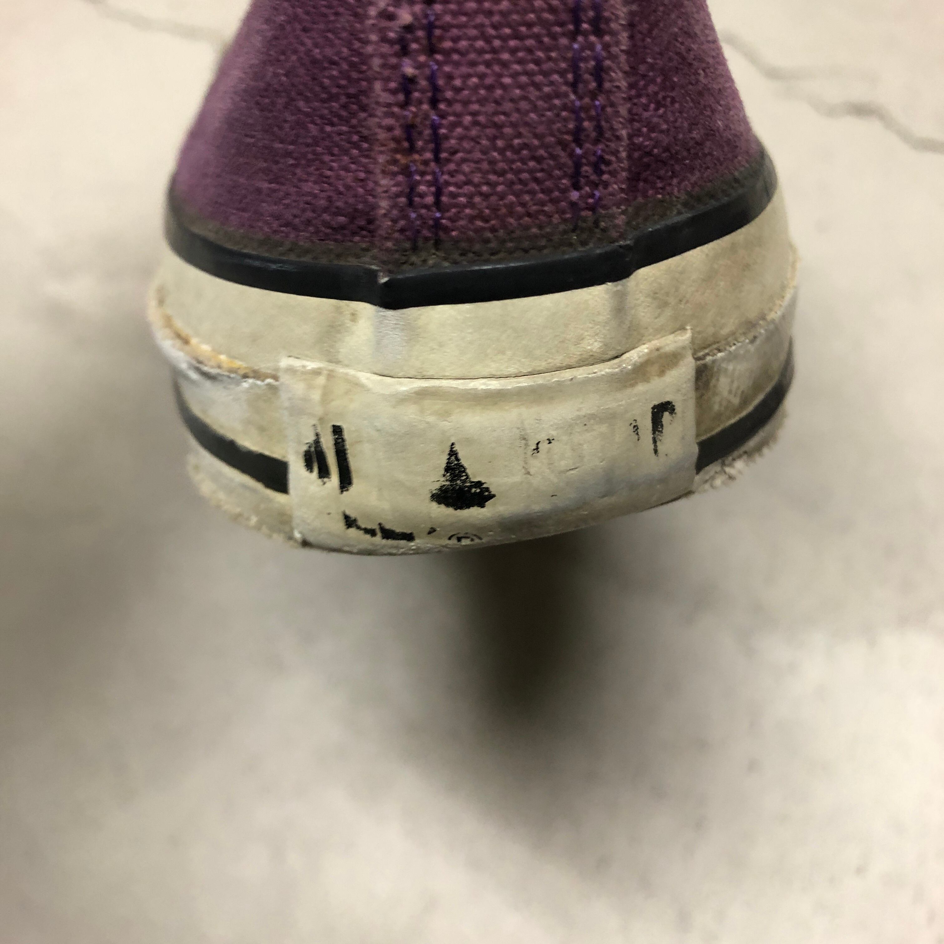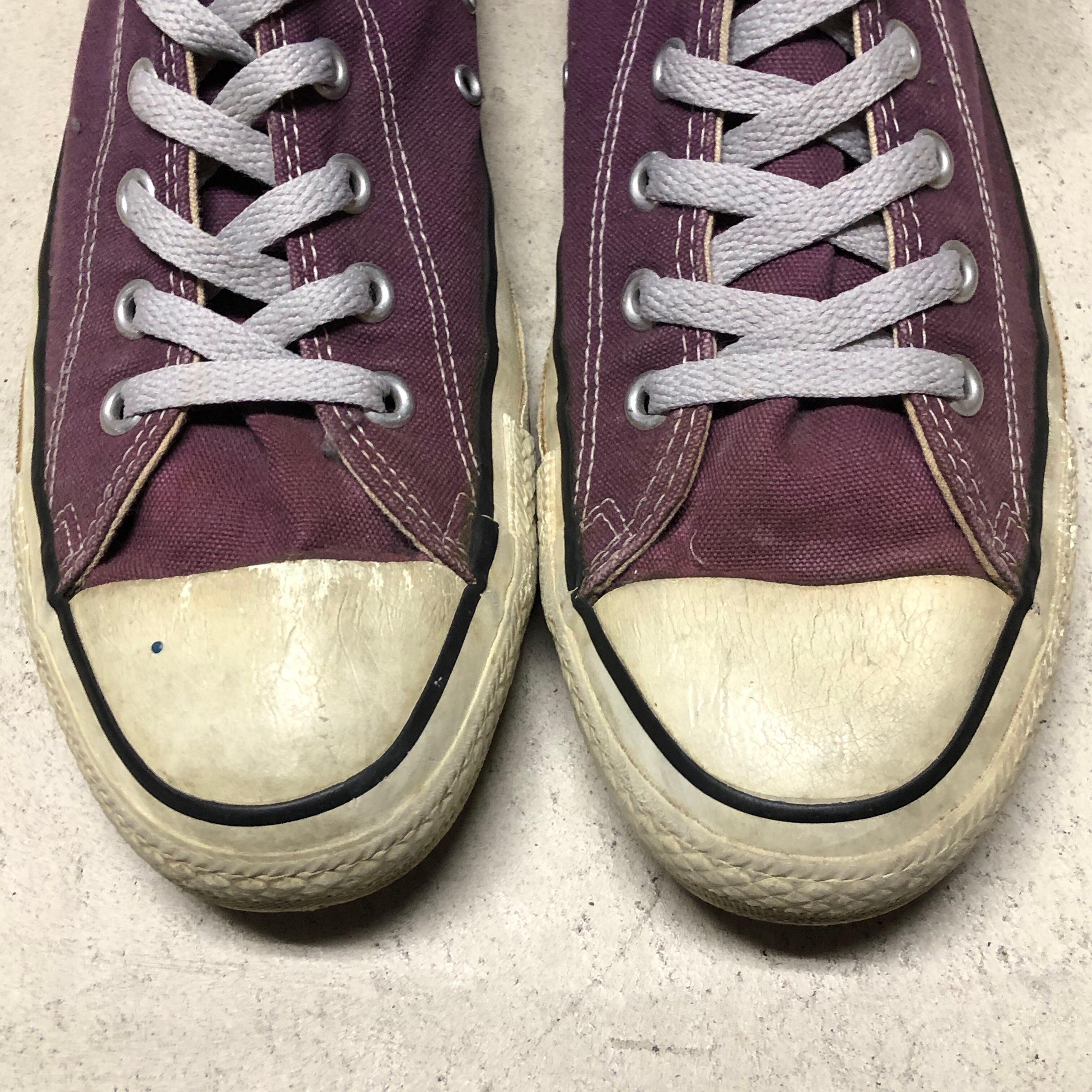 画像のように、履きジワや汚れ、シミ、ダメージ、ソールの減り、ソールとトゥーチップ部分の硬化等の着用感がございますが、古着慣れされた方でしたら問題無く着用可能です。