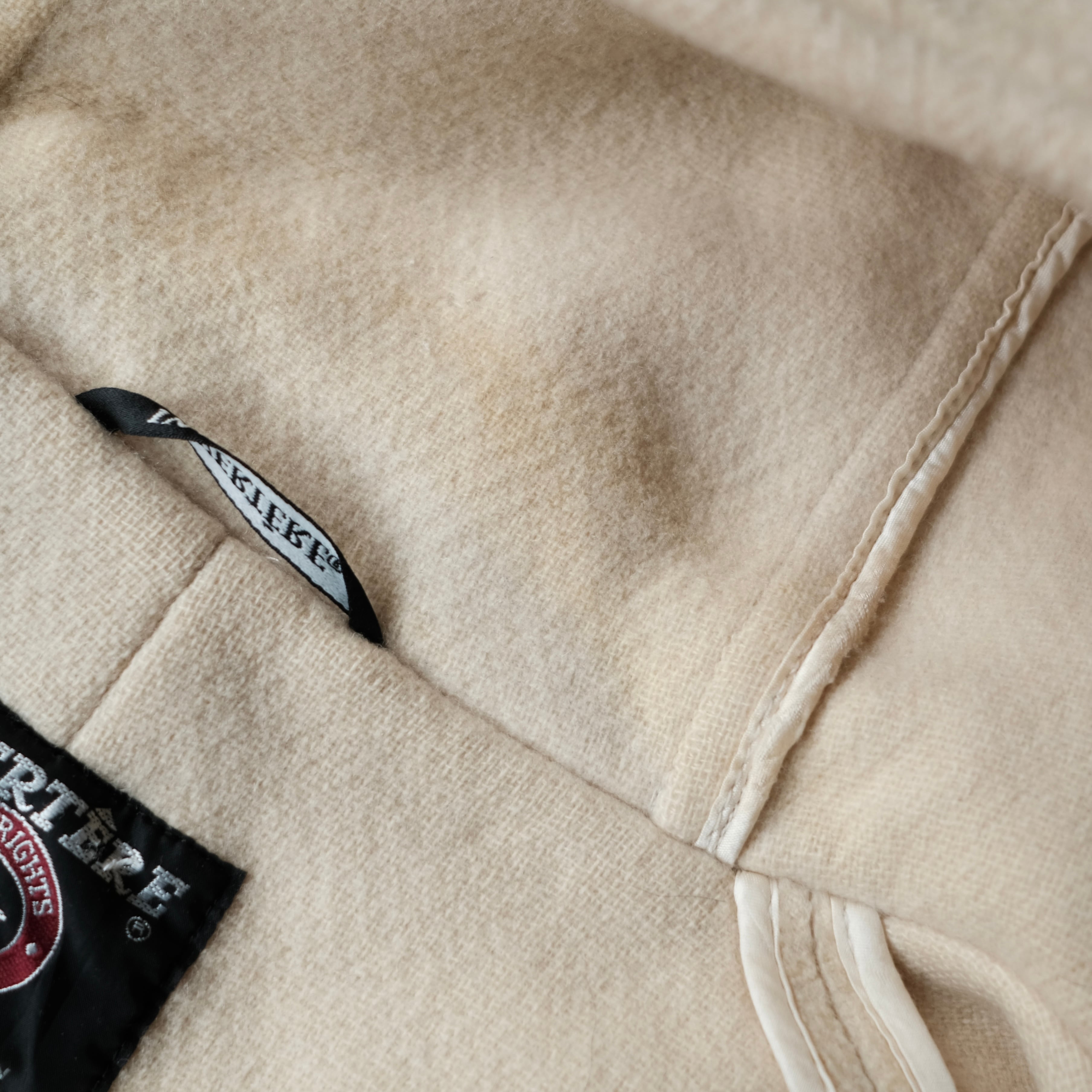 画像のように所々汚れやウール欠け等のダメージ、フラップ裏地のダメージがございます。
