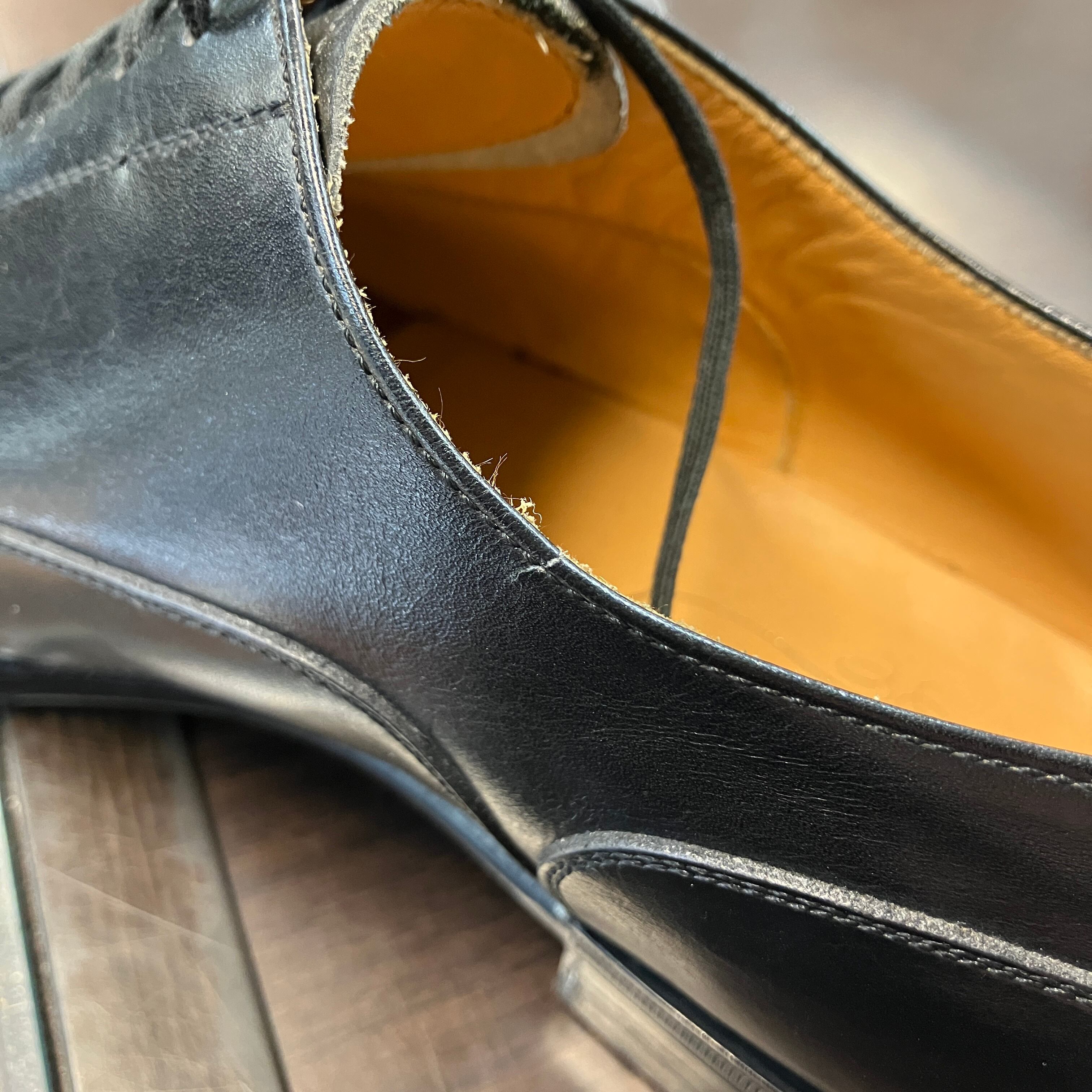 右足の履き口内側に小さなひび割れがございます。