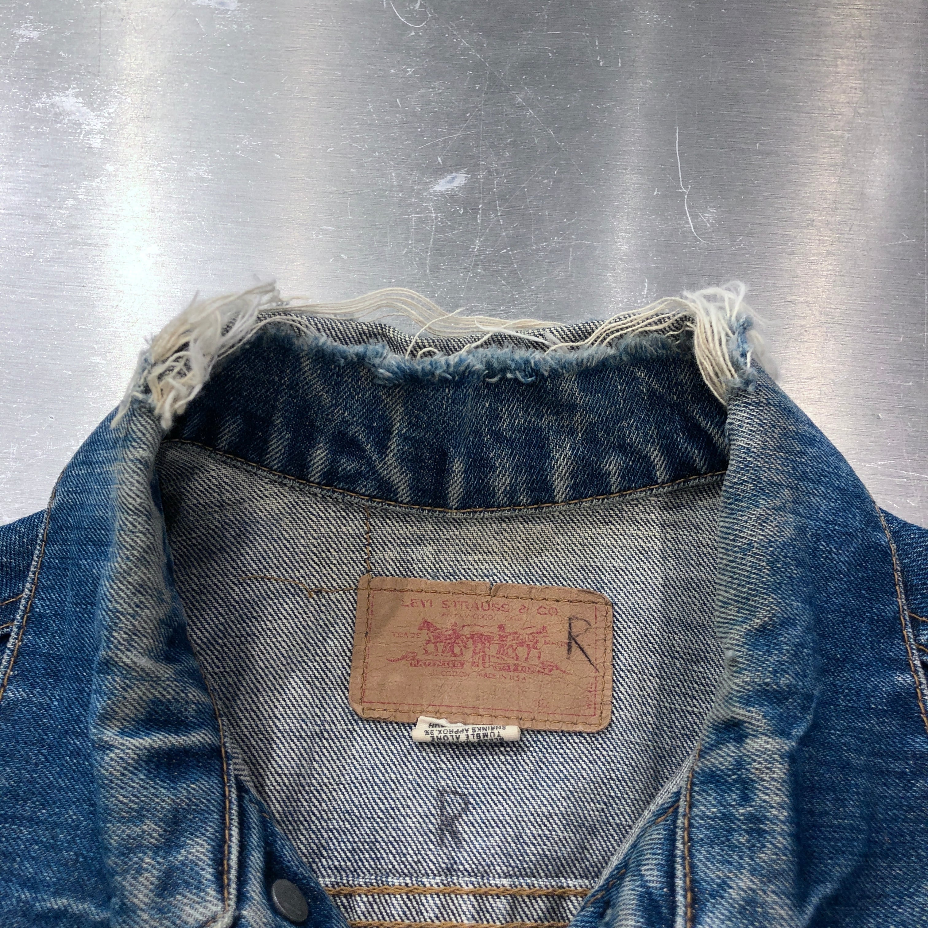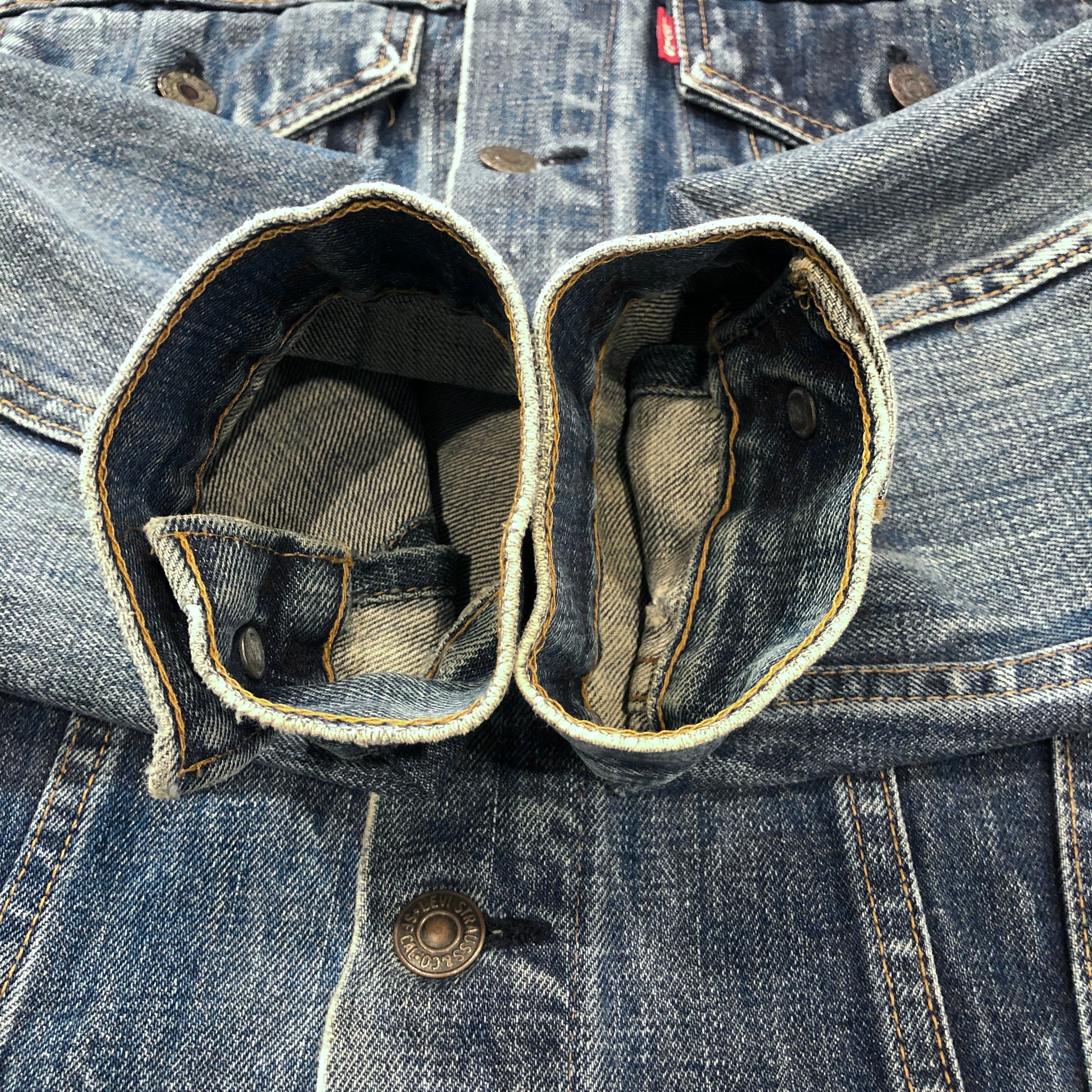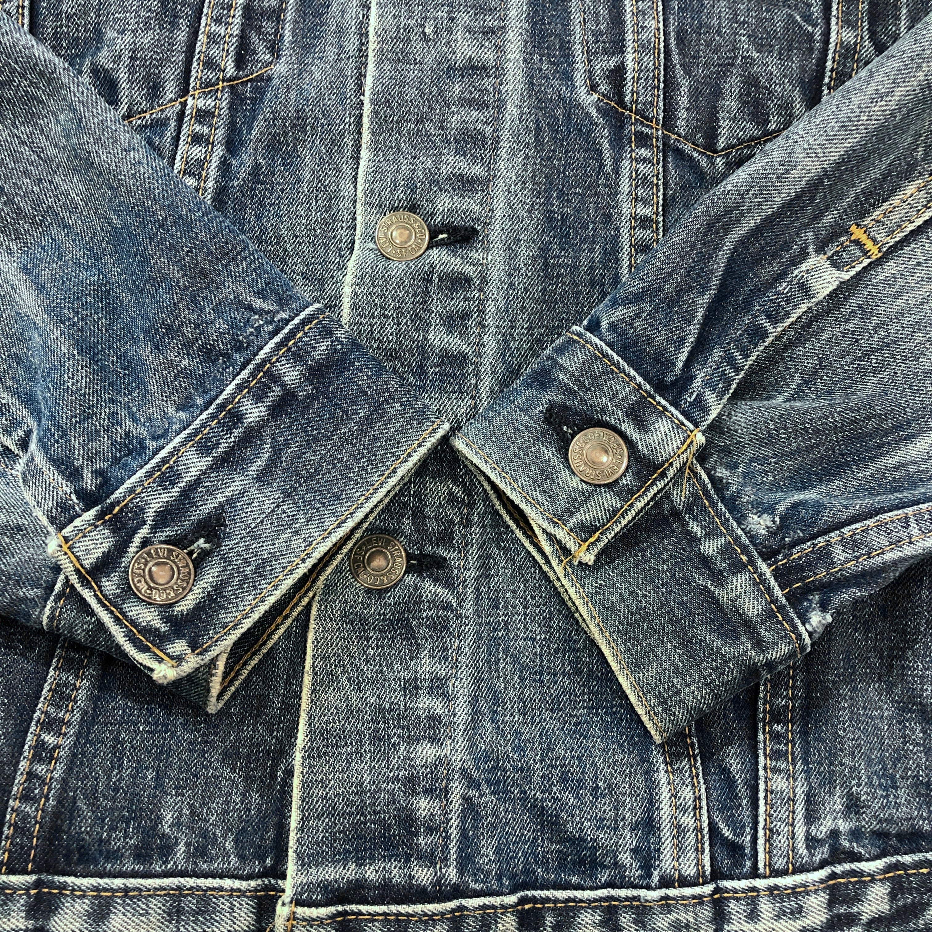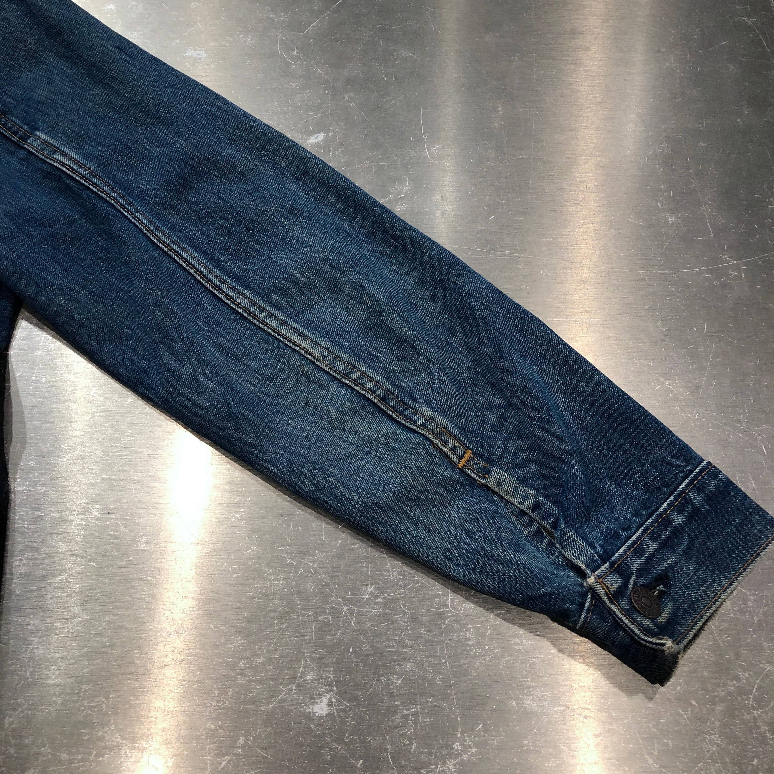 画像のように、襟がパンク、袖口がおり跡によるダメージがございます。その他傷や汚れ等ございますがビンテージ慣れされた方でしたら問題無く着用可能です。状態は画像にてご確認ください。
