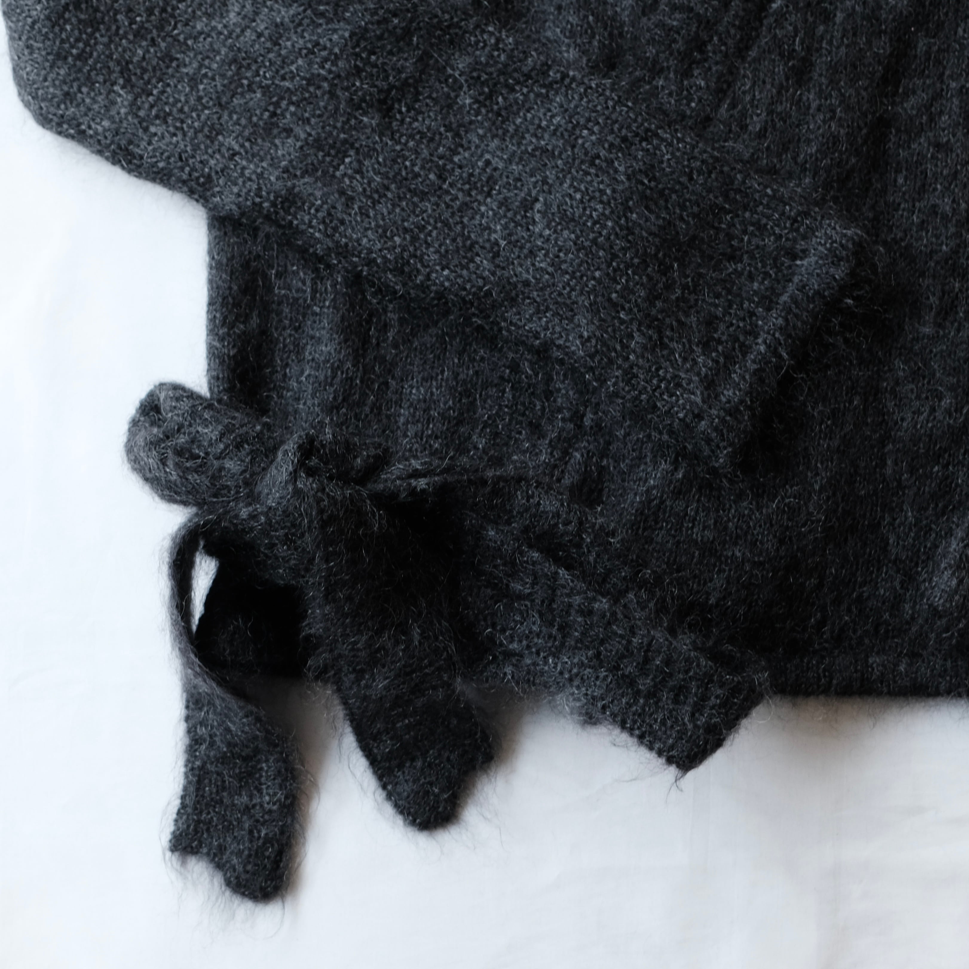左右それぞれの裾にベルト形状になったモヘア生地が長く編まれており、サイドで縛って着ていただくディテール。