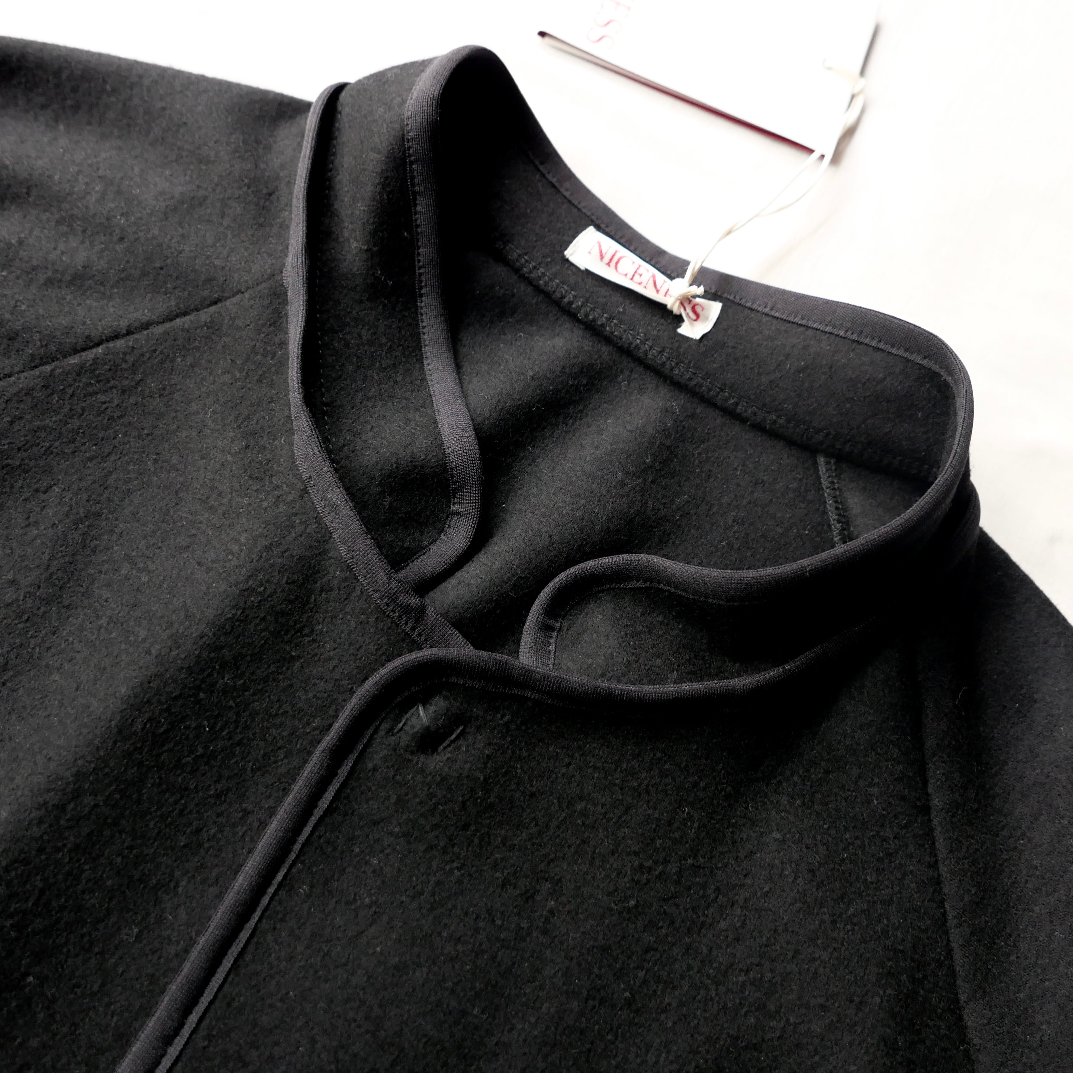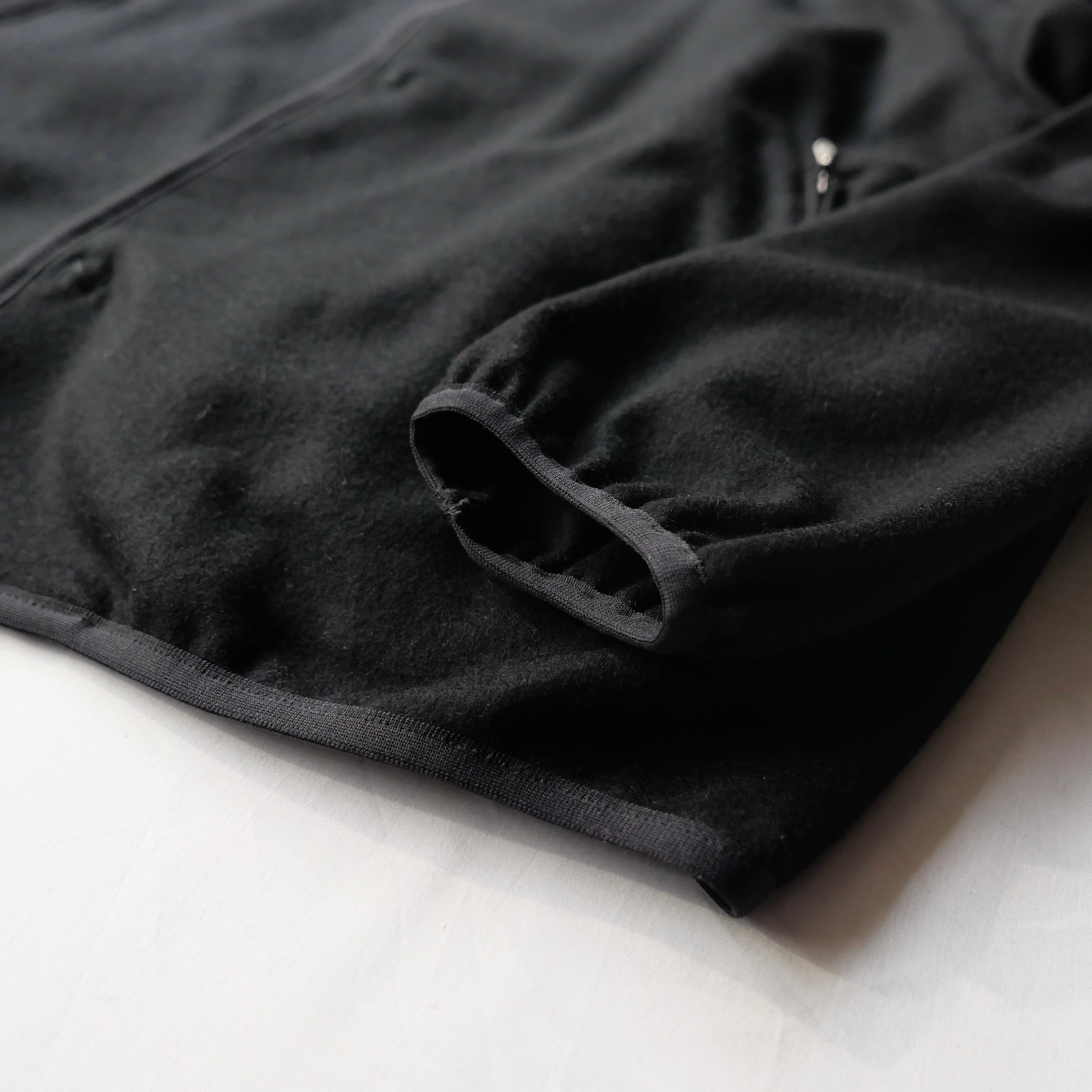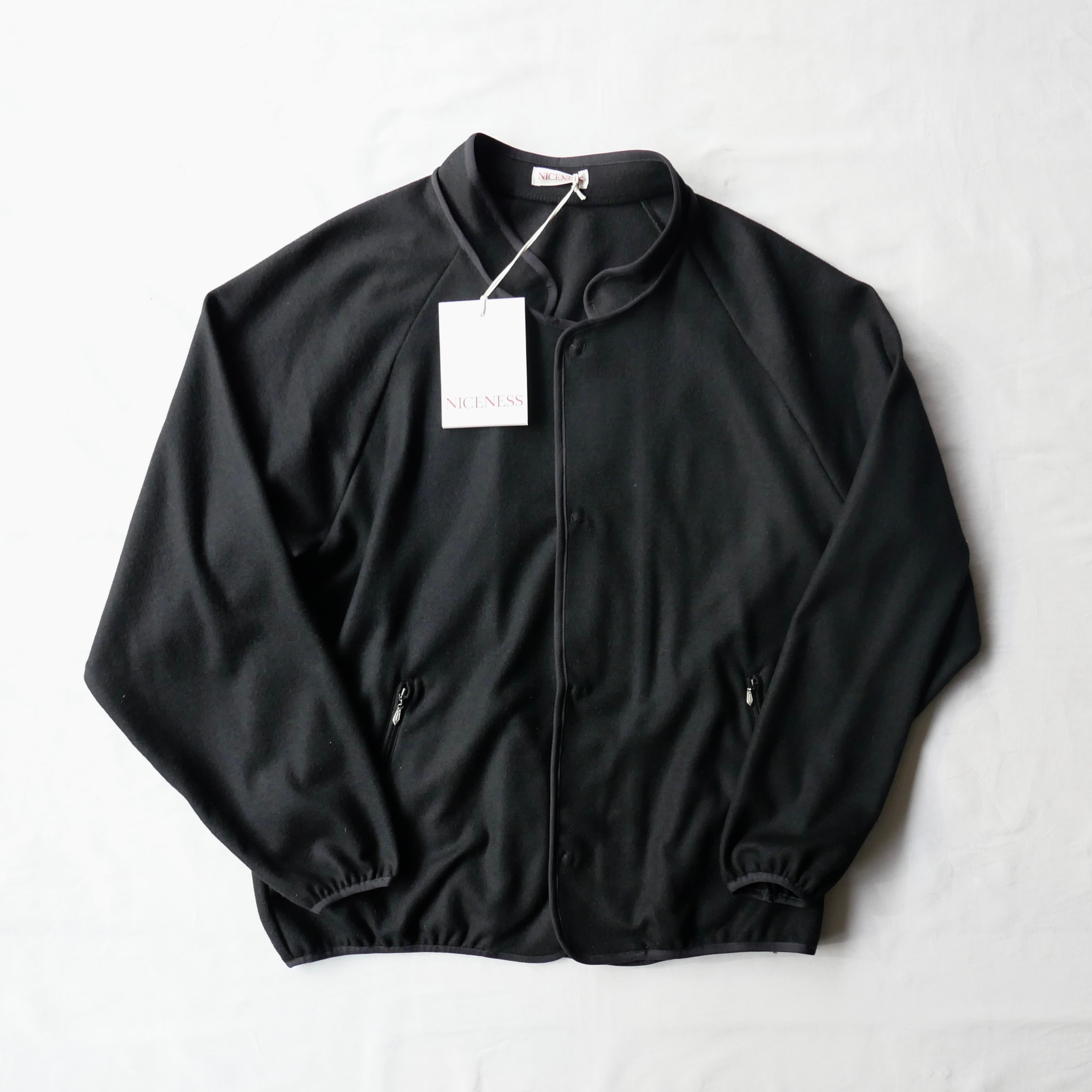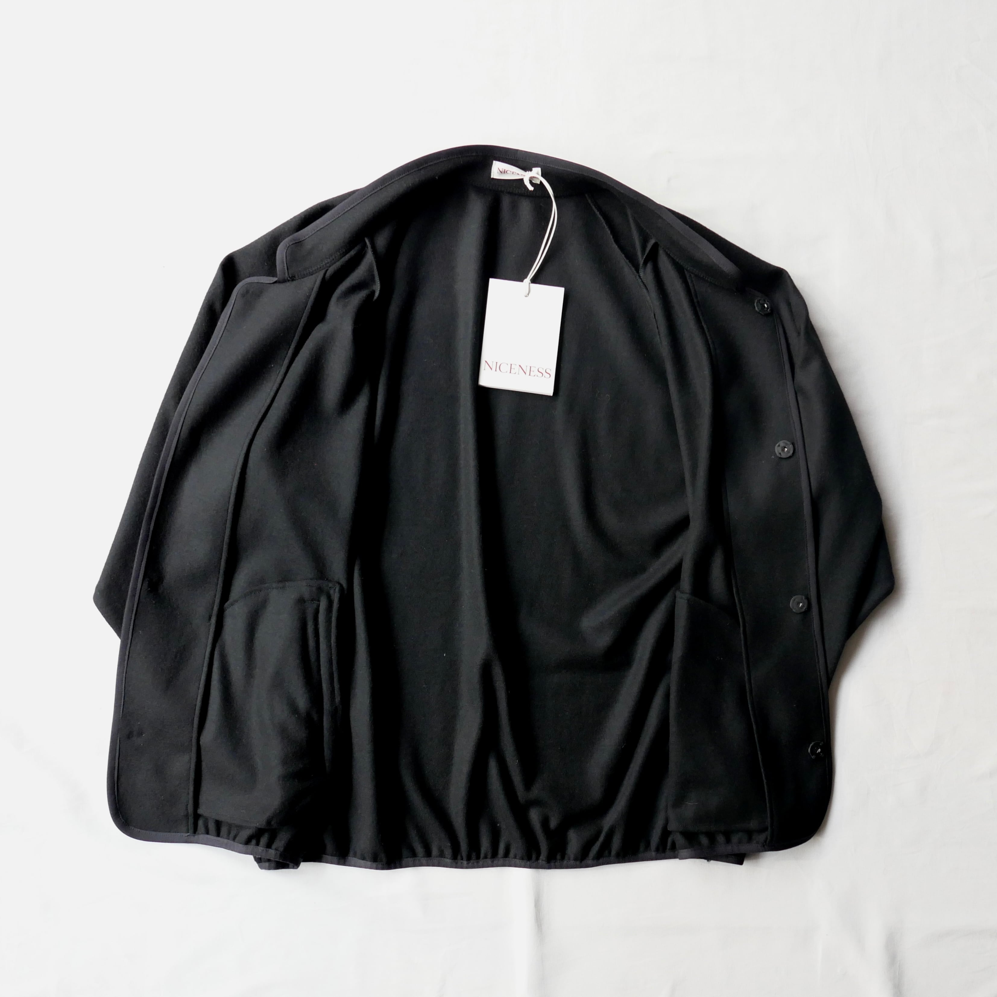SUPER 120'Sの縮絨ジャージーウールを使ったジャケットで、スナップボタンでミニマルなデザインの中に各所のパイピングやスタンドカラーが程良いアクセントとなってますね。襟は内側に折ればクルーネック、外に折ればラペルカラーとしてもお使いいただける仕様です。