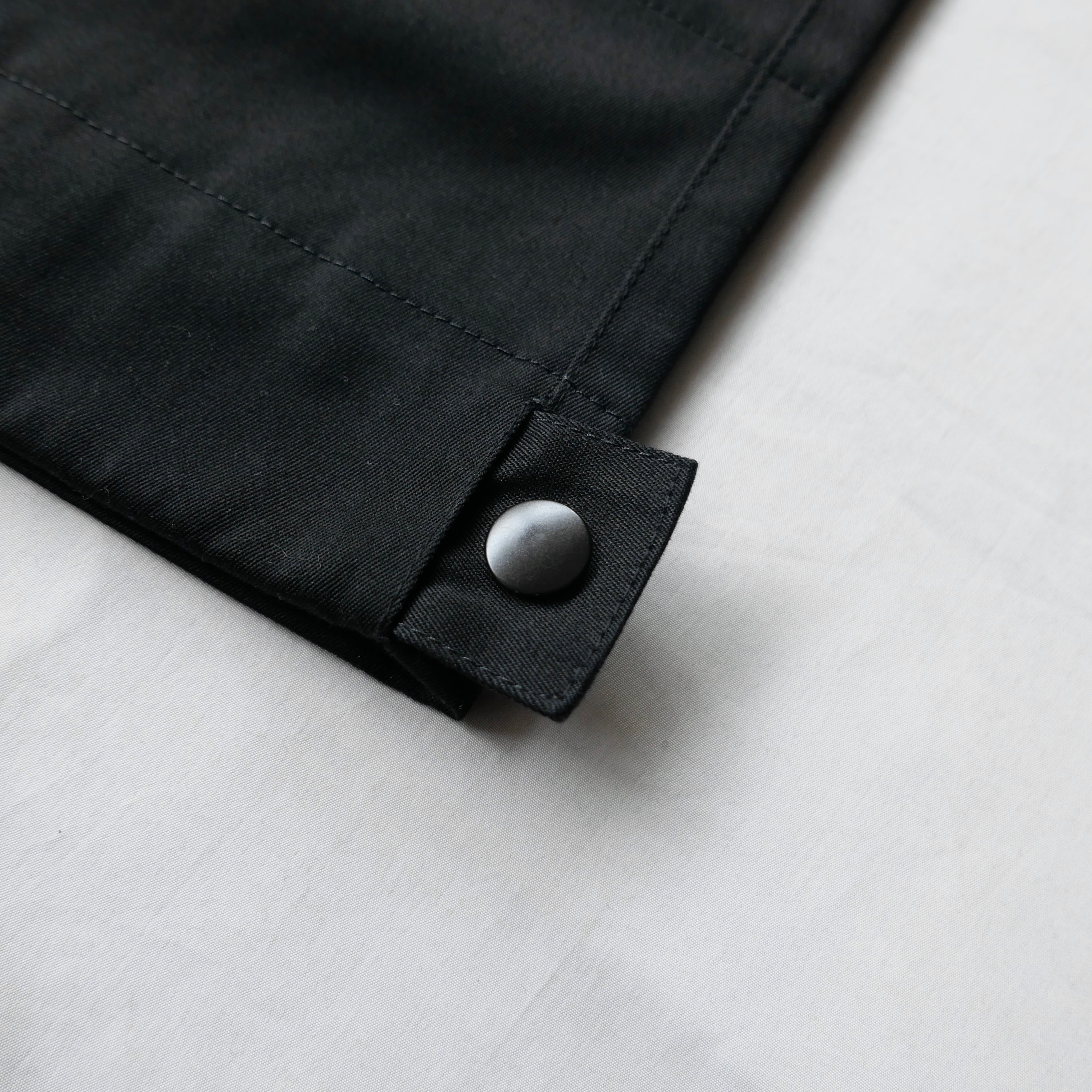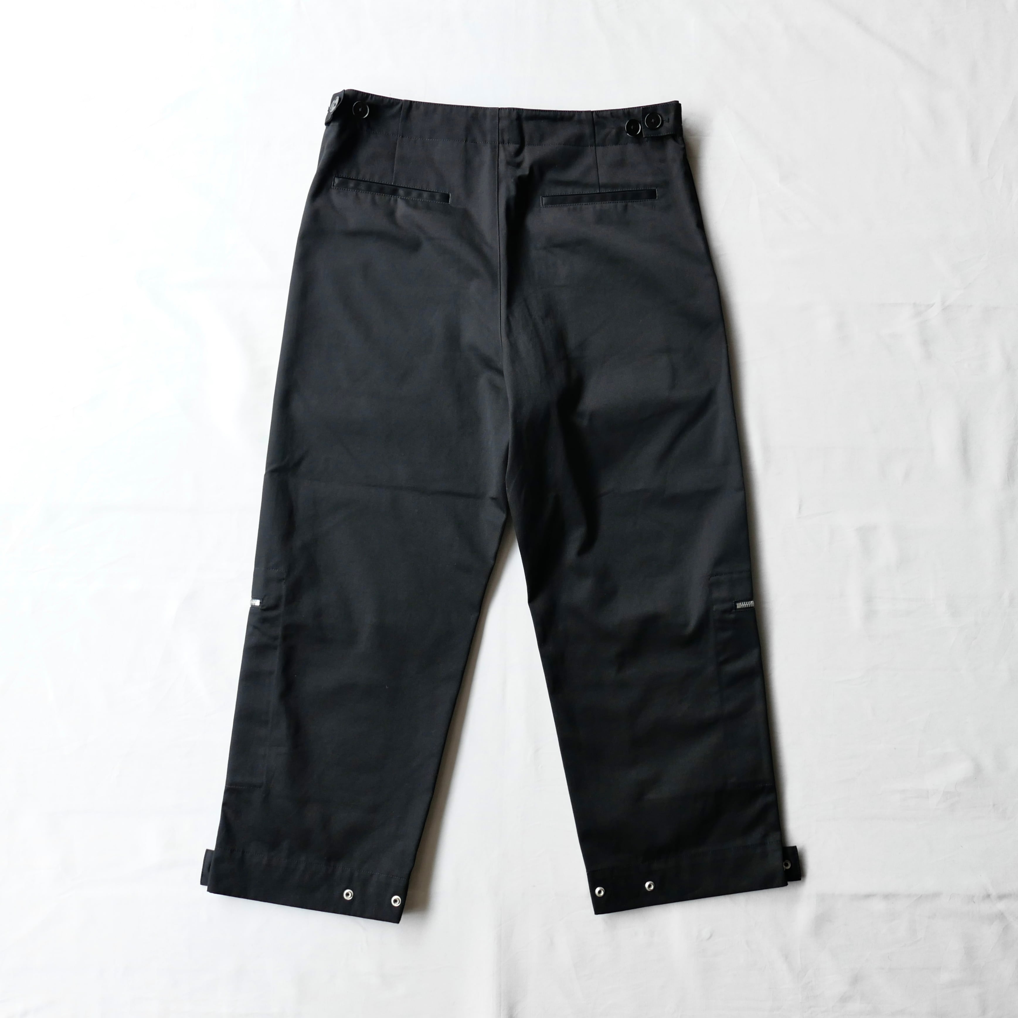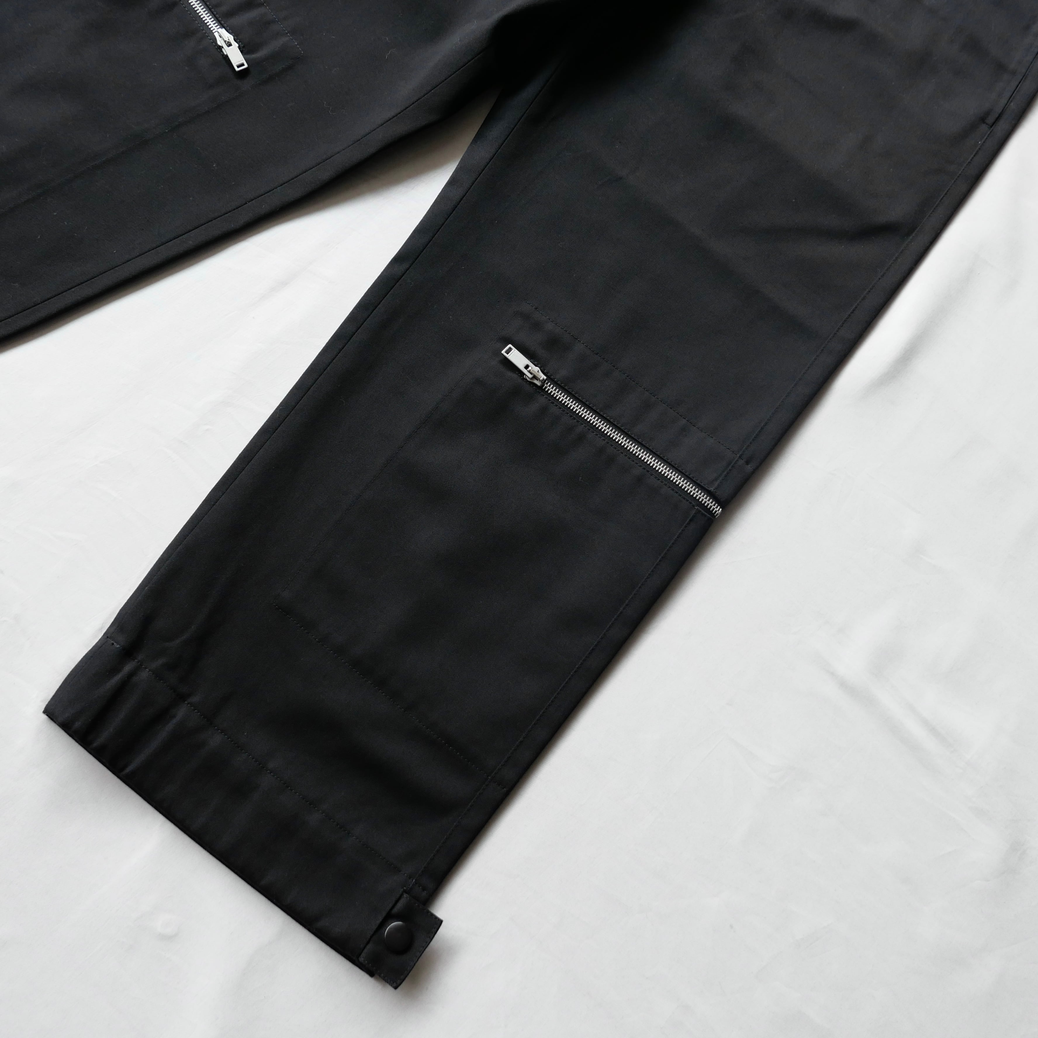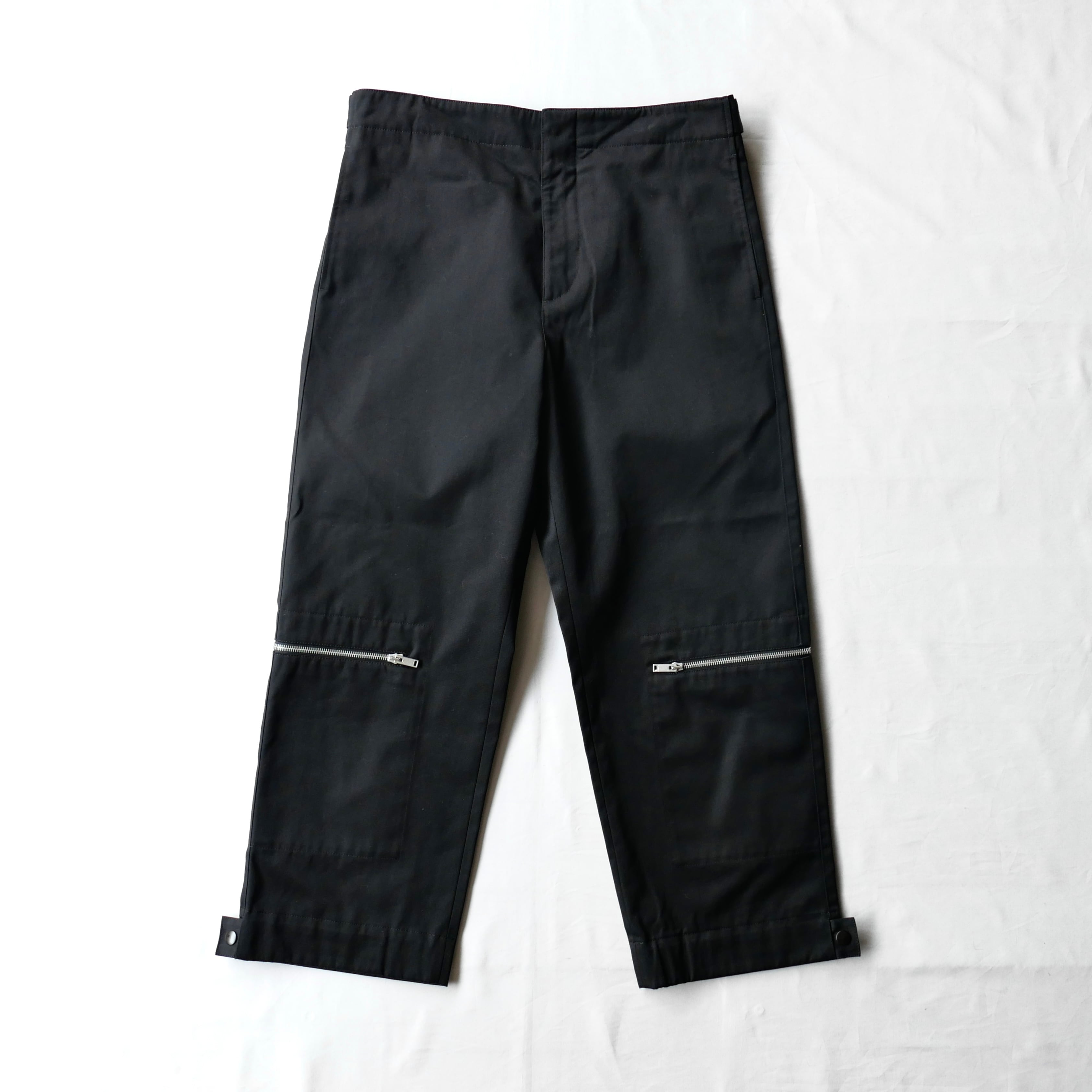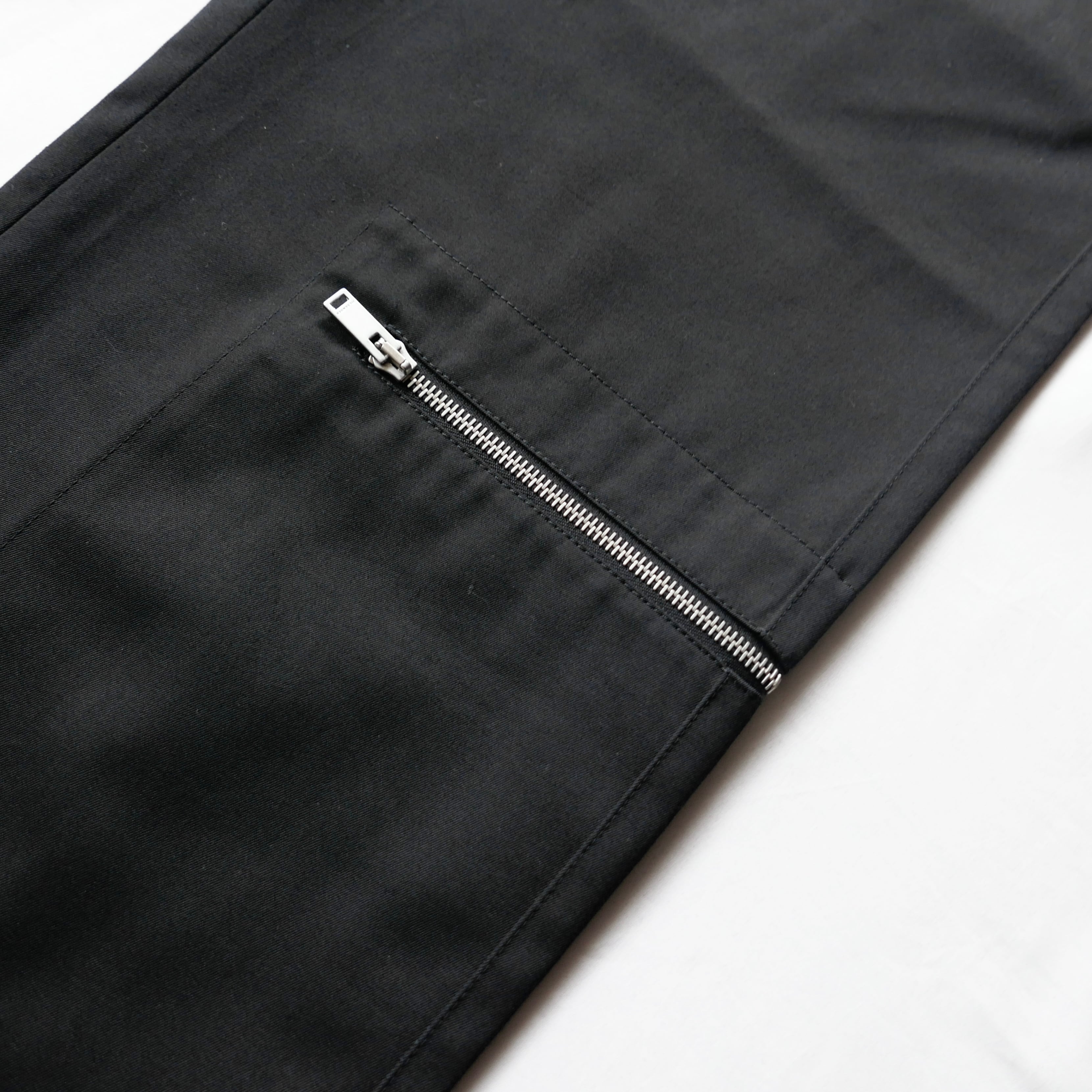 ブラックコットンのパンツの膝にジップの付いたデザイン。