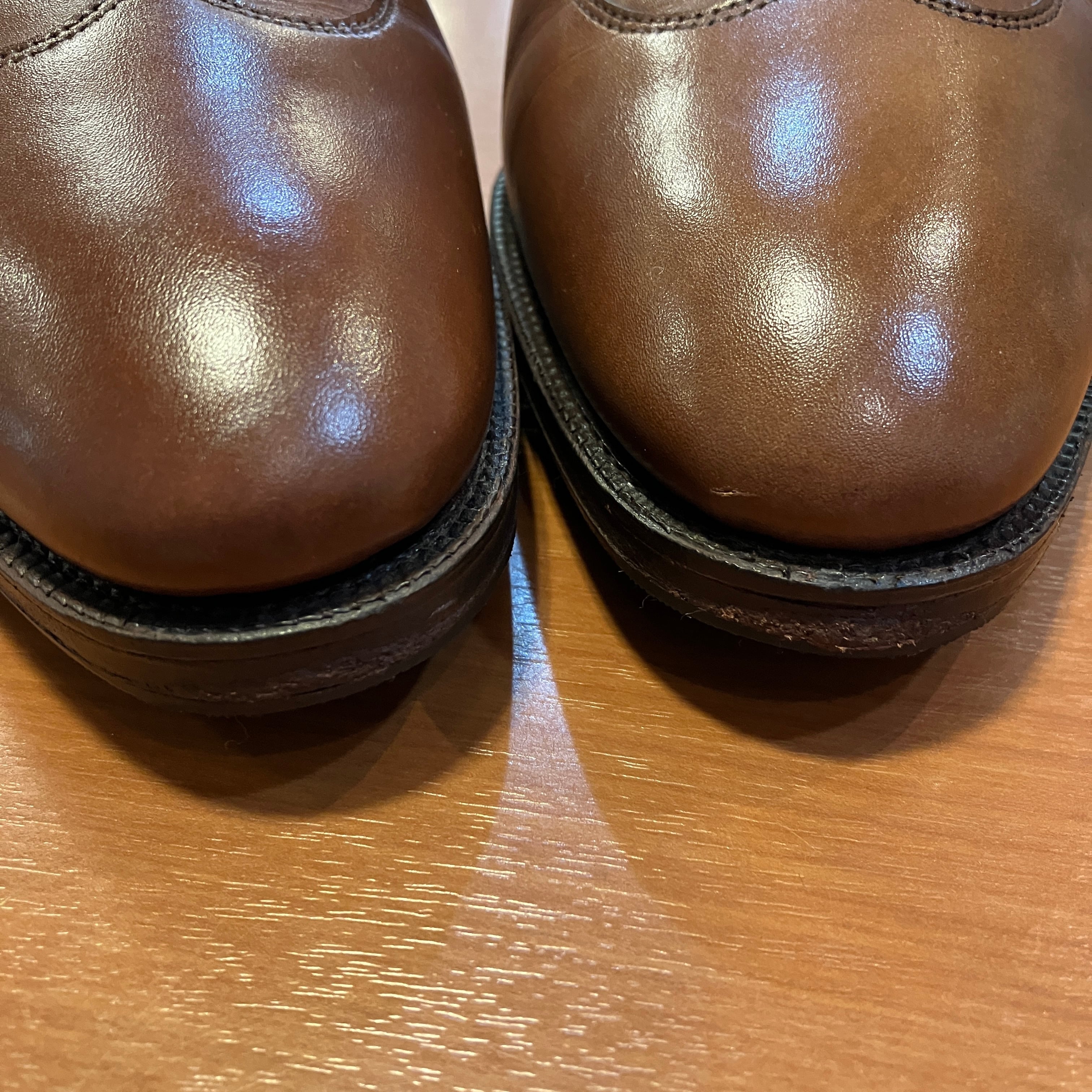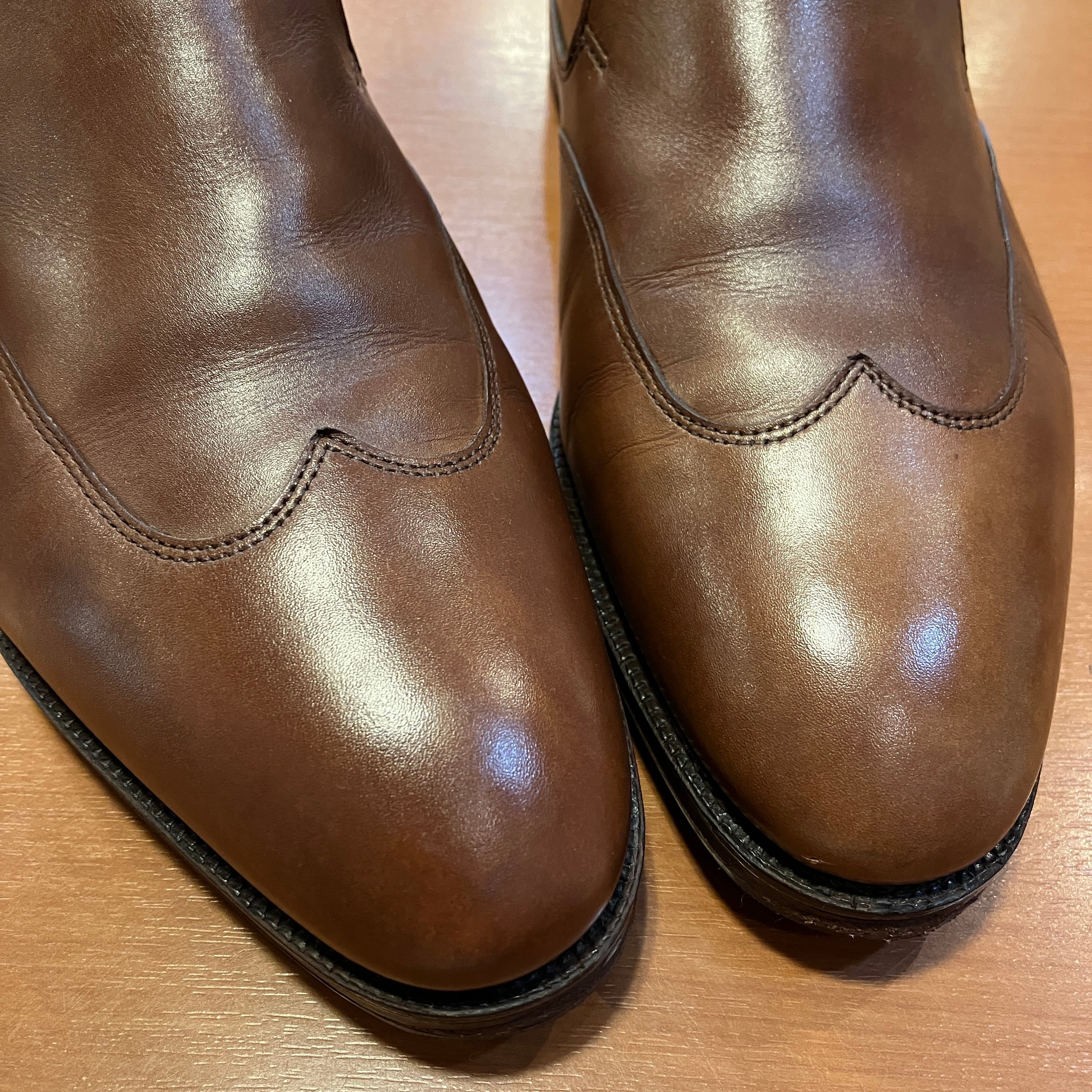 左右に若干の色ムラ、履き皺やスレが見られます。