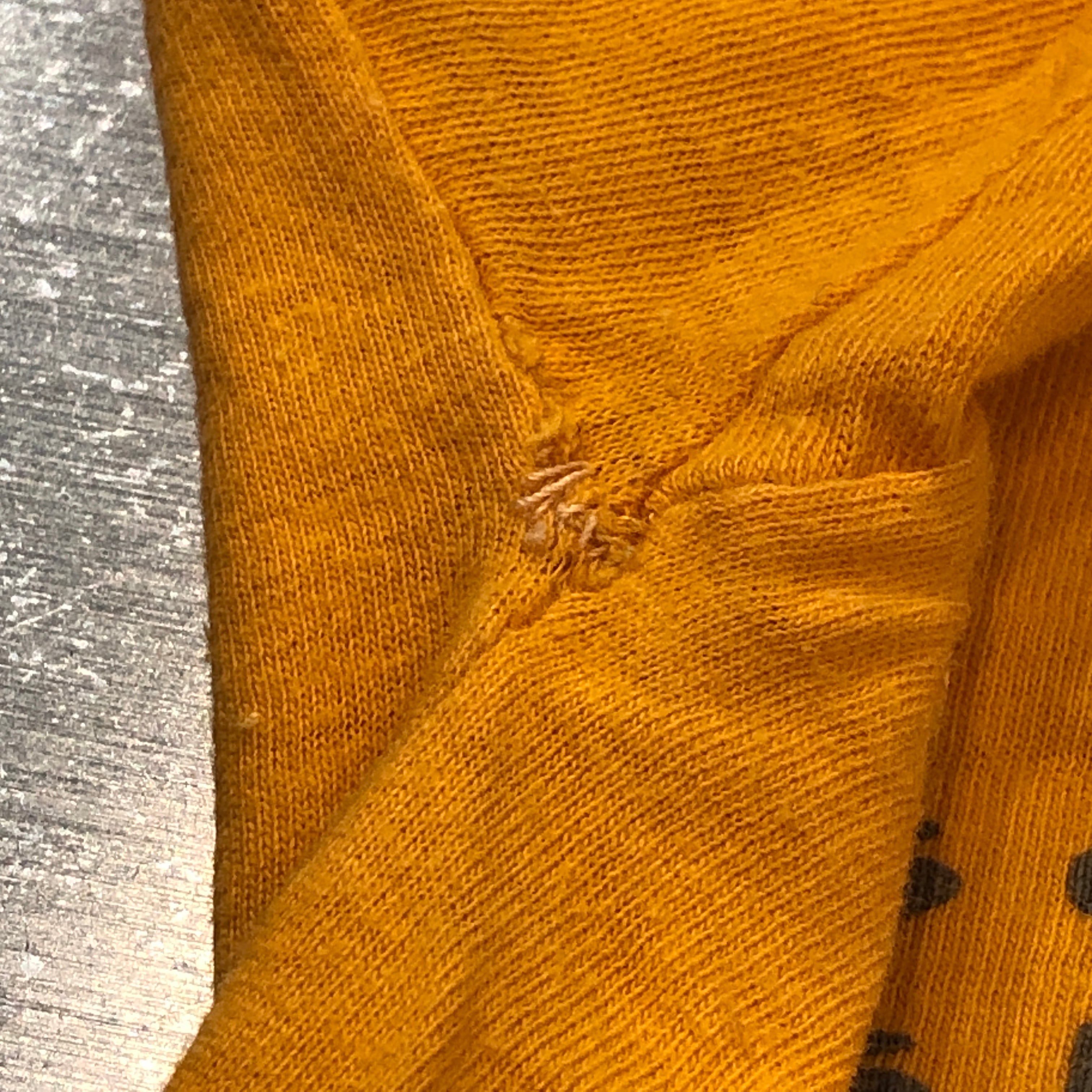 画像のように襟元、脇にホツレ、右袖に小さな穴がございます。