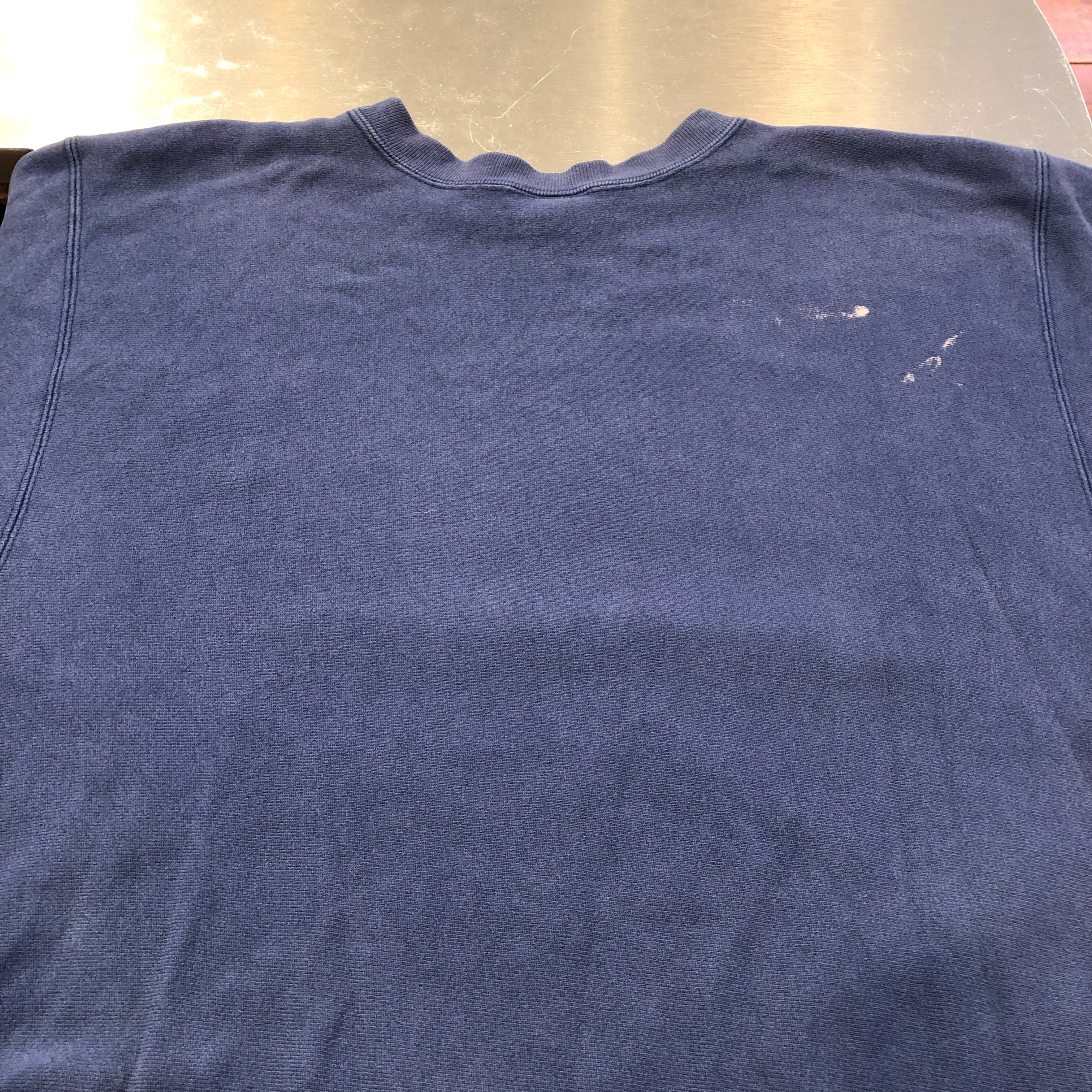 画像のように、首元にヨレ、プリント下、バックにペンキ汚れがございます。