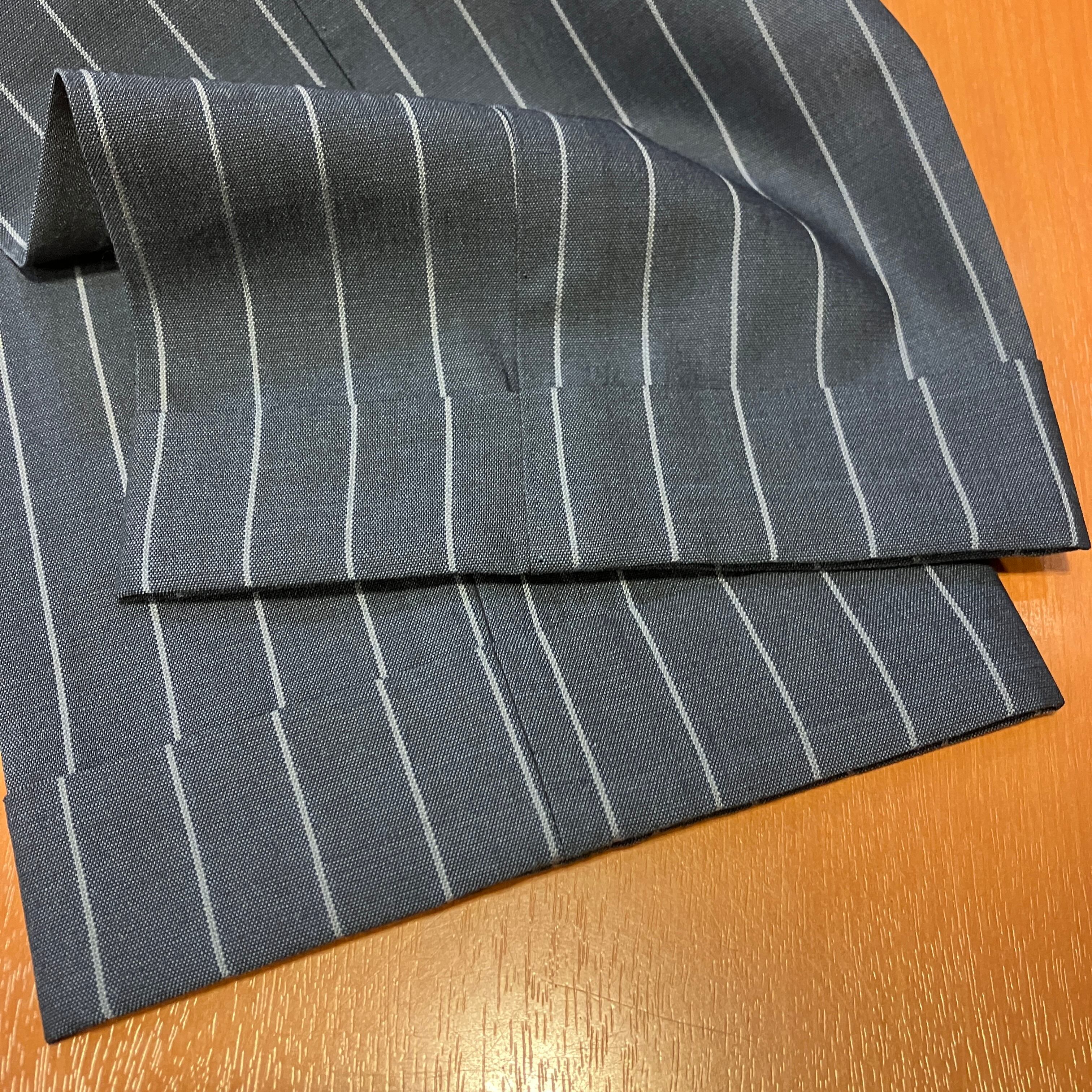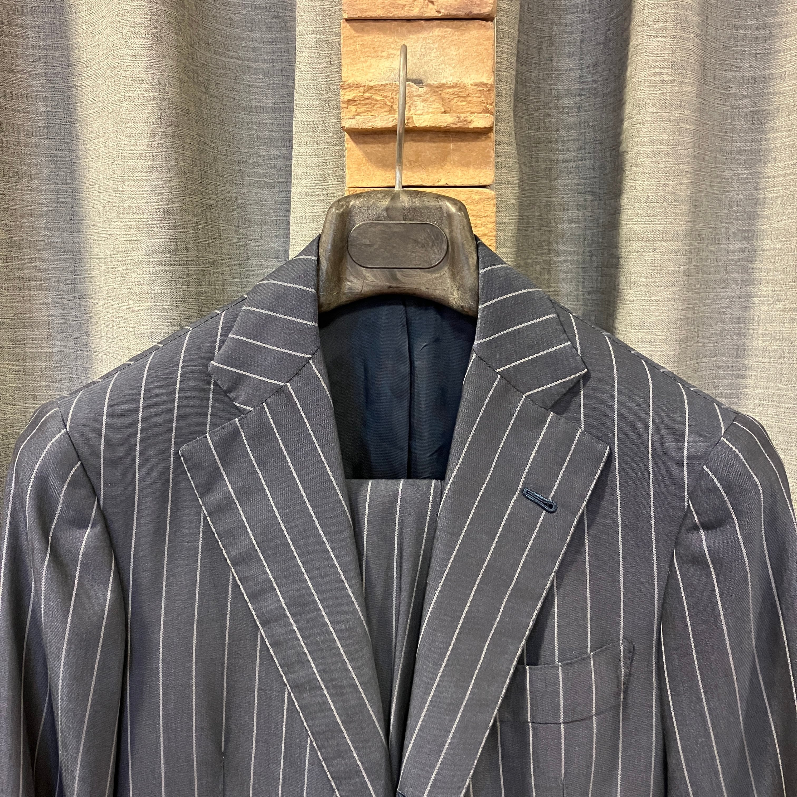 シャリ感のあるドライタッチと、透け感のある軽やかな生地感です。春夏に適したサマーウールスーツです。