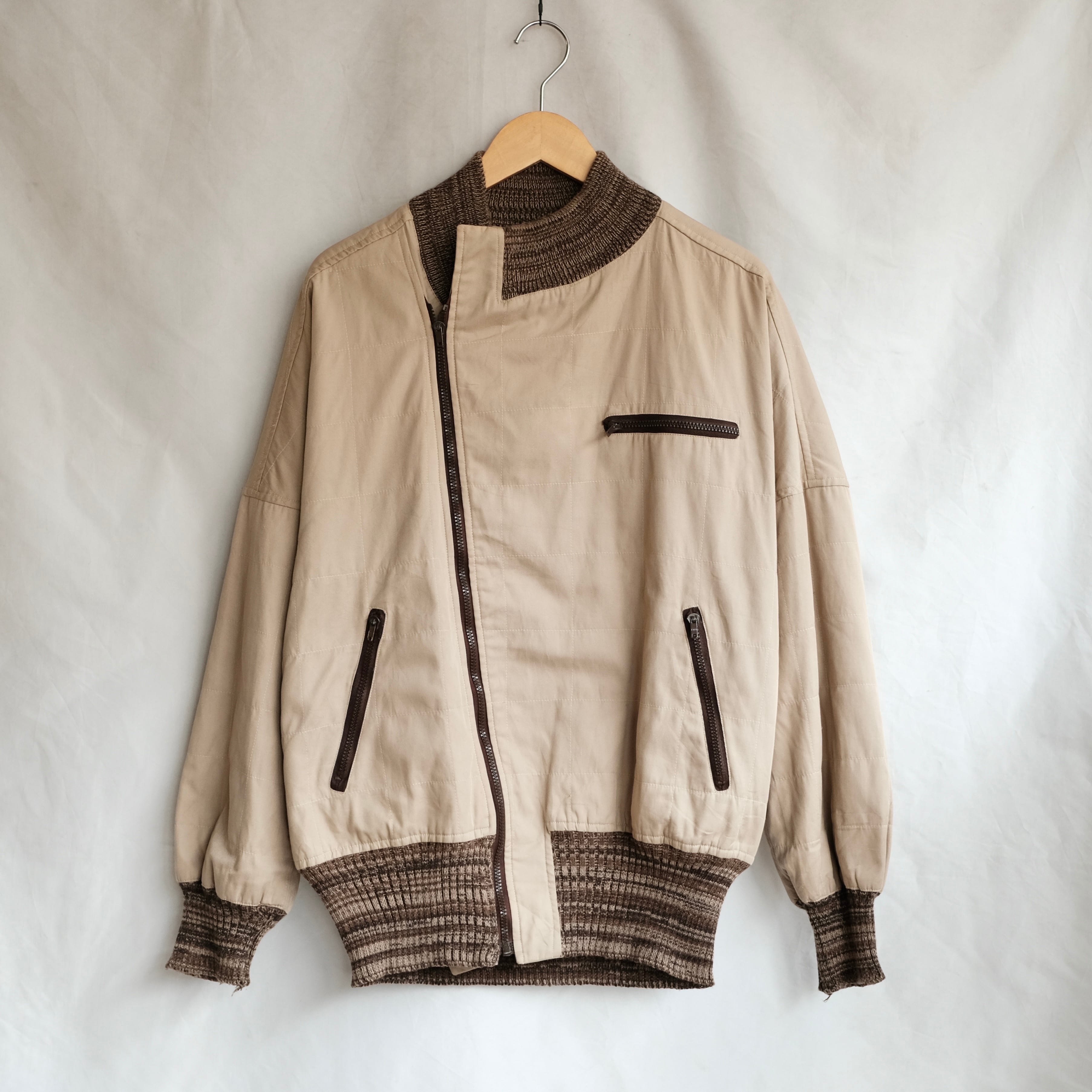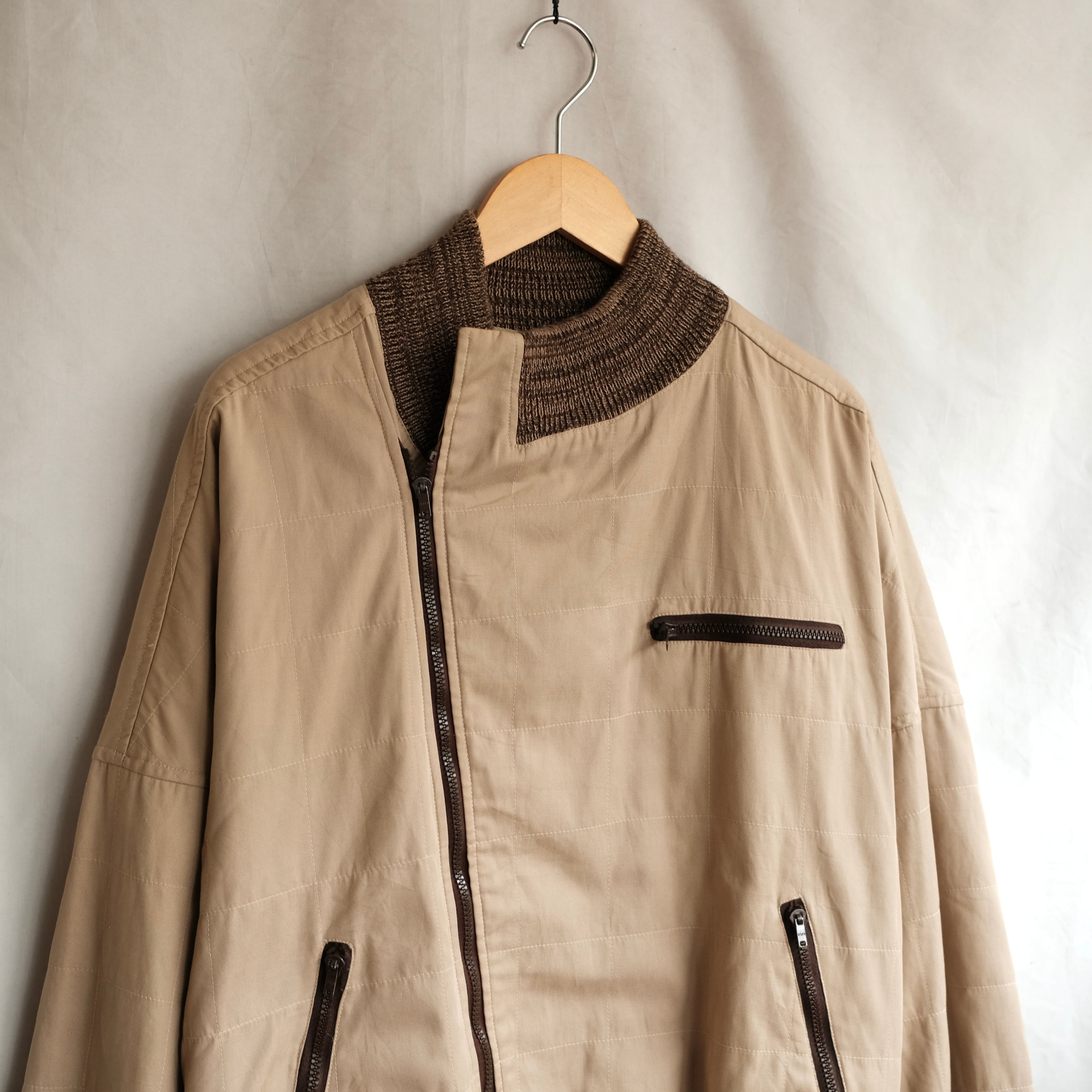 近年、ARMANIのアーカイブが軒並み高騰している中、当時のARMANIの美学が前面に出ているこのデザイン。斜めのジップから始まり、美しく、計算されたキルティング加工、リブの絶妙な色味。そしてそこにallegriの高い縫製技術と素材使い、設計力が合わさった非の打ちどころのない一着です。
